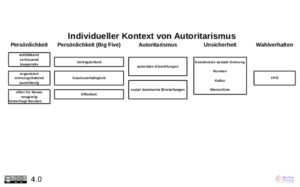 Der Begriff Autoritarismus umschreibt das Bedürfnis nach einer starken Führungsperson, nach Unterordnung, gleichzeitig aber auch nach Dominanz gegenüber anderen Gruppen, nach Tradition und nach law and order – vor allem, wenn es um die Bestrafung von Fehltritten anderer Gruppen geht. Autoritarismus wirkt sich meist dann auf das Wahlverhalten aus, wenn das Niveau der Unsicherheit steigt, wenn die bestehende Ordnung bedroht ist.