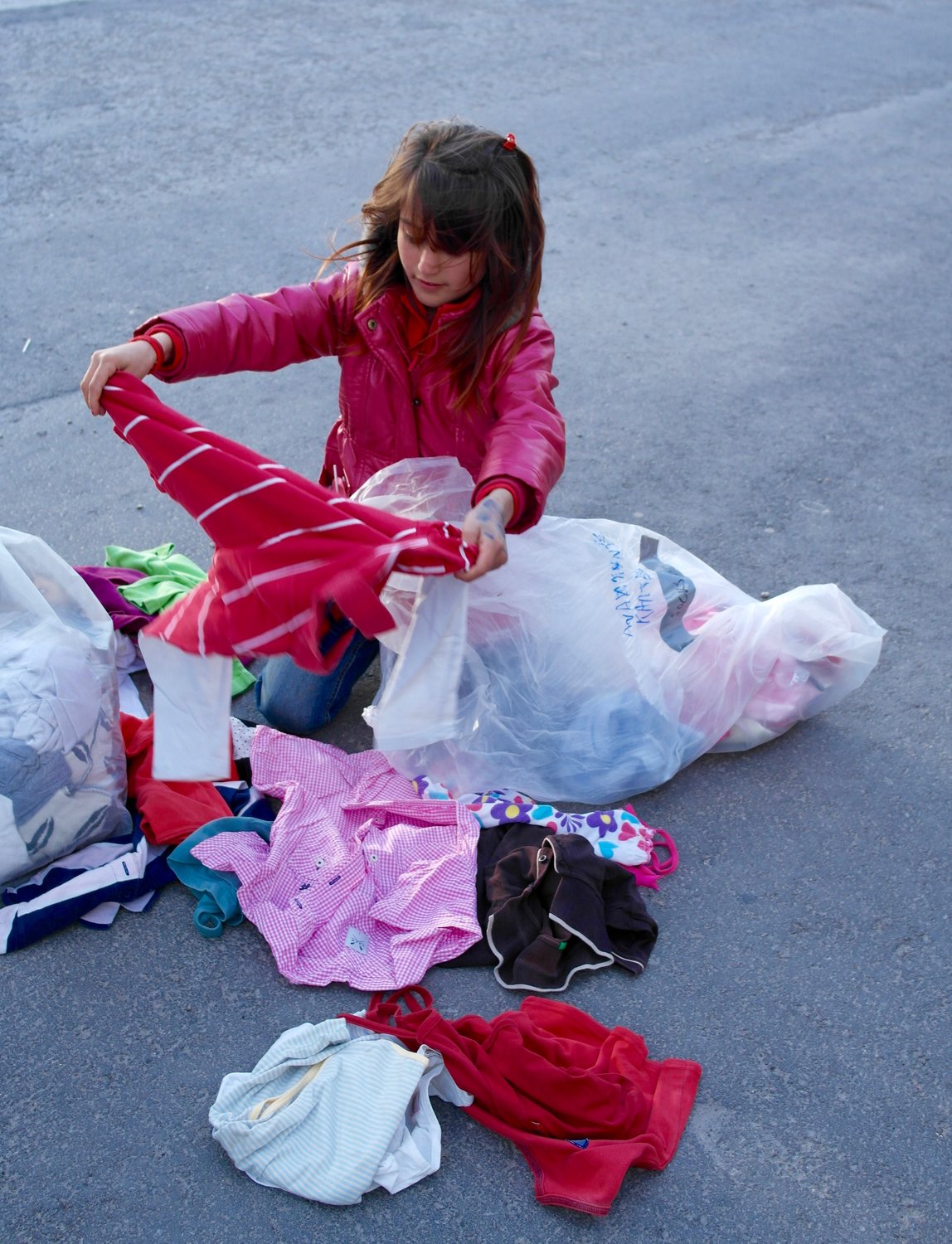 Nach einiger Zeit wird mir klar, dass einige der Kinder, die Kleider und Schuhe suchen, gar keine “Flüchtlingskinder” sind, sondern Zigeuner. Sie fangen gierig an, ihre Taschen voll mit Essen und neuen Kleidern zu packen, obwohl die Regel besteht, dass Flüchtlinge von jedem Kleidungsstück oder Essen nur ein Stück bekommen sollen. Seither werfe ich ein Auge auf sie und bitte sie immer wieder, das Überschüssige zurückzulegen.