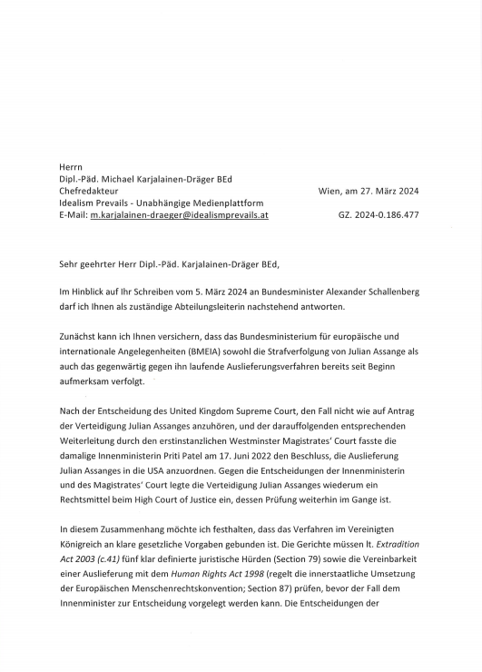 Es ist aus meiner Sicht als freischaffender Journalist und Publizist sowie als Chefredakteur der seit 2016 bestehenden unabhängigen Medienplattform Idealism Prevails höchst an der Zeit, dass auch Sie als politische Vertreter eines der immerwährenden Neutralität verpflichteten Staates Initiative für eine Enthaftung des WikiLeaks-Gründers Julian Assange ergreifen und ihre Beziehungen bzw. ihre politische Macht für dessen umgehende Freilassung einsetzen.