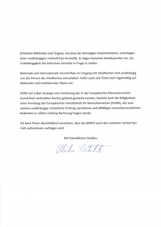 „Gerade wurde in Großbritannien Julian Assanges Antrag, den U.S. Auslieferungsantrag beeinspruchen zu können, angenommen. Großbritannien hat einen funktionierenden Rechtsstaat und eine unabhängige Gerichtsbarkeit, deren Entscheidung es jetzt abzuwarten gilt.“