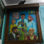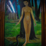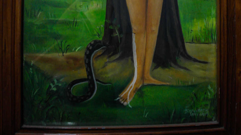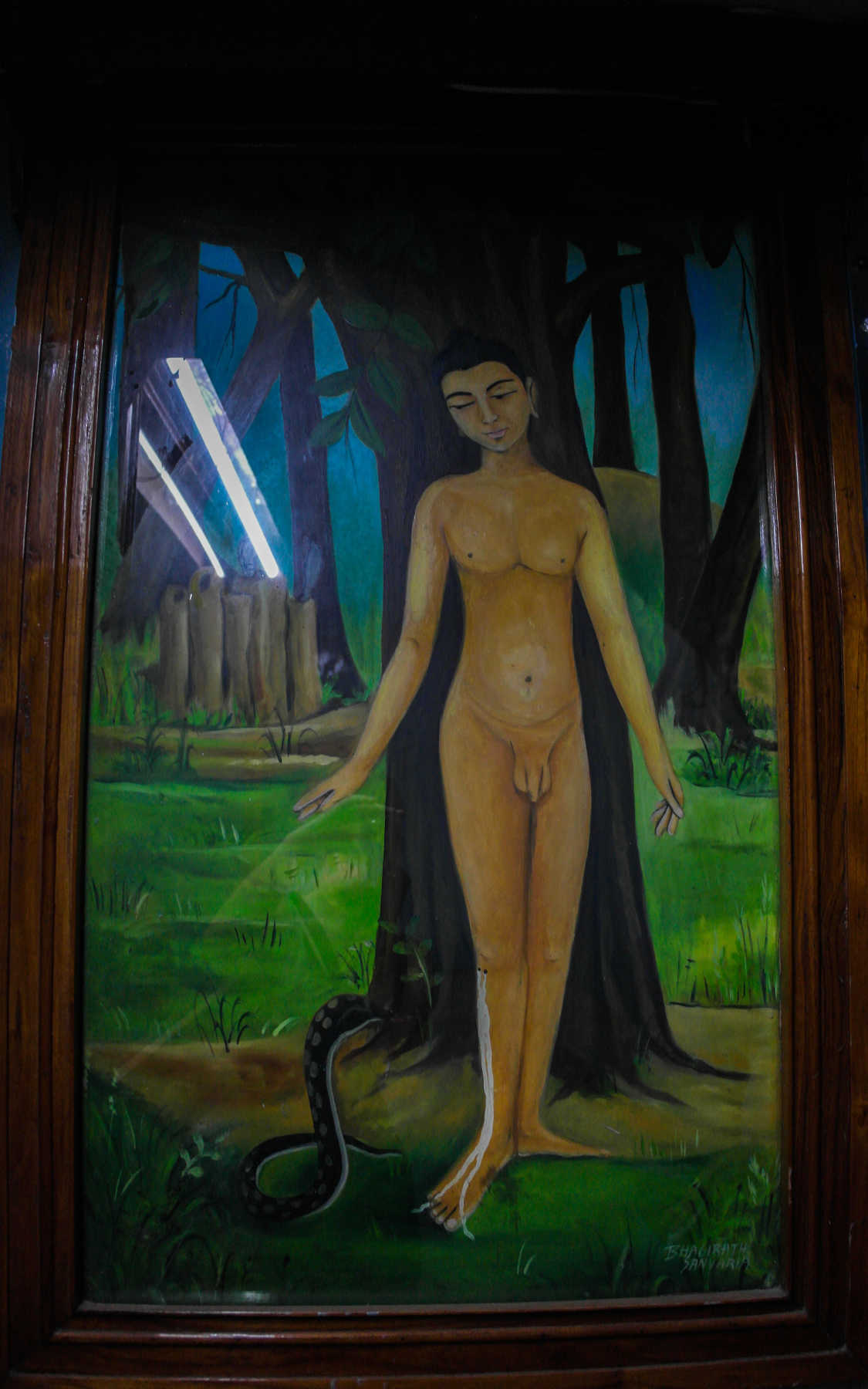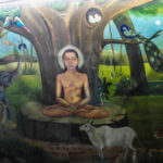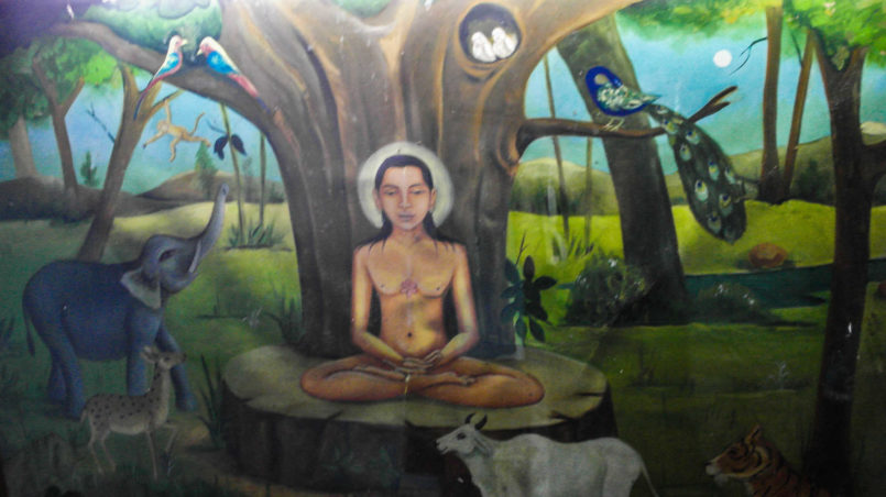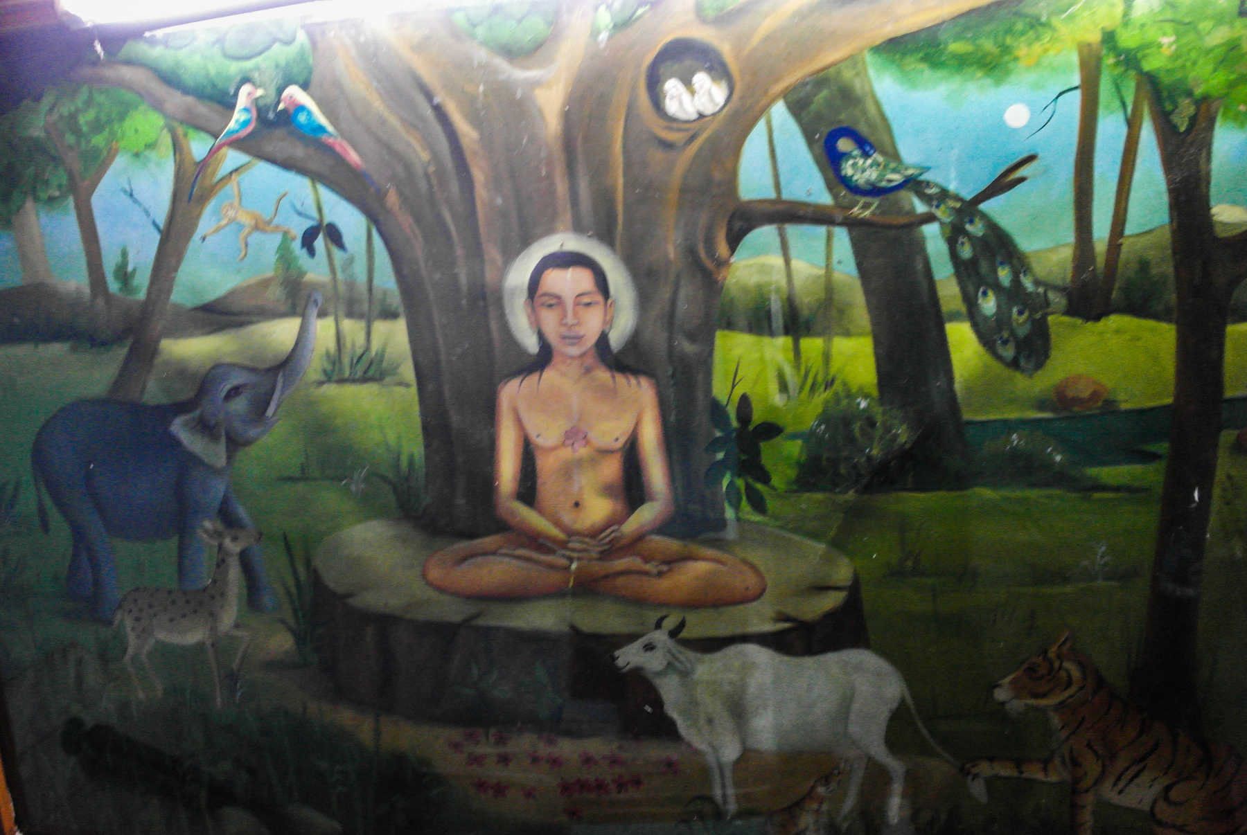 Da ich sehr neugierig bin, was das sein könnte, steige ich die Treppe hinauf bis in den dritten Stock. An den Wänden hängen zahlreiche Gemälde; Gemälde von Anhängern des Jainismus und von Mahavira selbst, dem letzten spirituellen Lehrer dieser Religion. Vor allem zwei der Bilder erregen meine Aufmerksamkeit: Eines zeigt einen Jain, der in dem bekannten Lotossitz des Joga (dem Padmasana) in der Natur mit dem Rücken zu einem Baum sitzt und meditiert, von Tieren umgeben. Das andere zeigt Mahavira, stehend und mit einer Schlange neben ihm. Obwohl viele Schlangen giftig und potenziell tödlich sind, werden sie in der indischen Kultur verehrt. Die Schlange auf dem Gemälde hat Mahavira gerade gebissen, doch anstelle von Blut tritt Milch aus der Wunde.