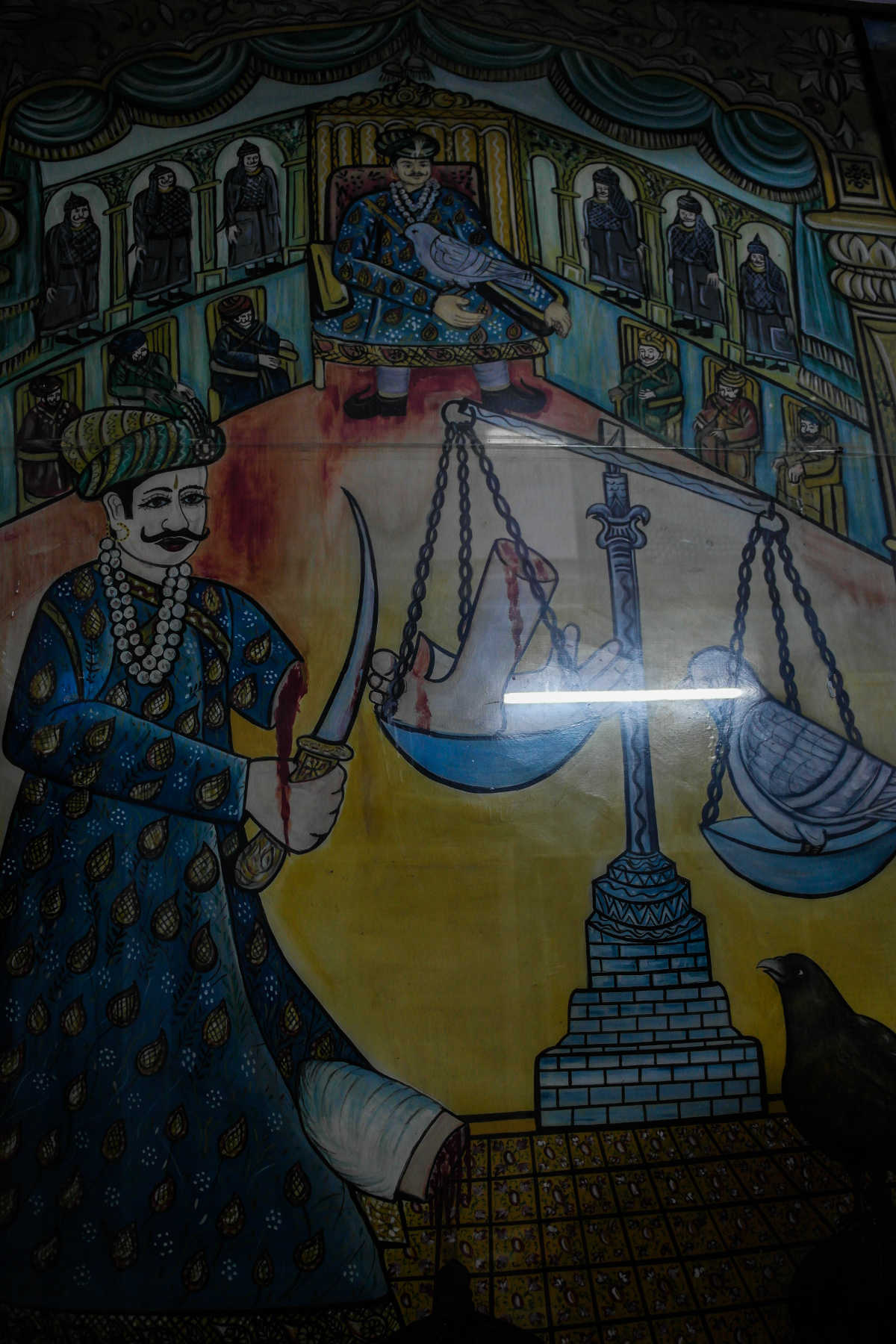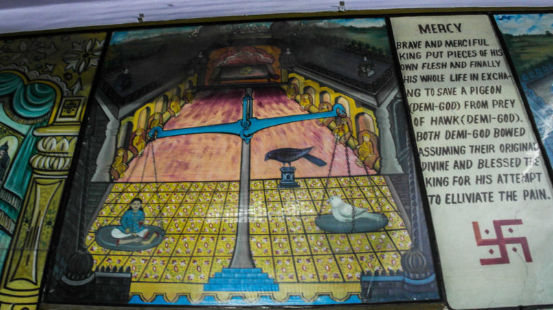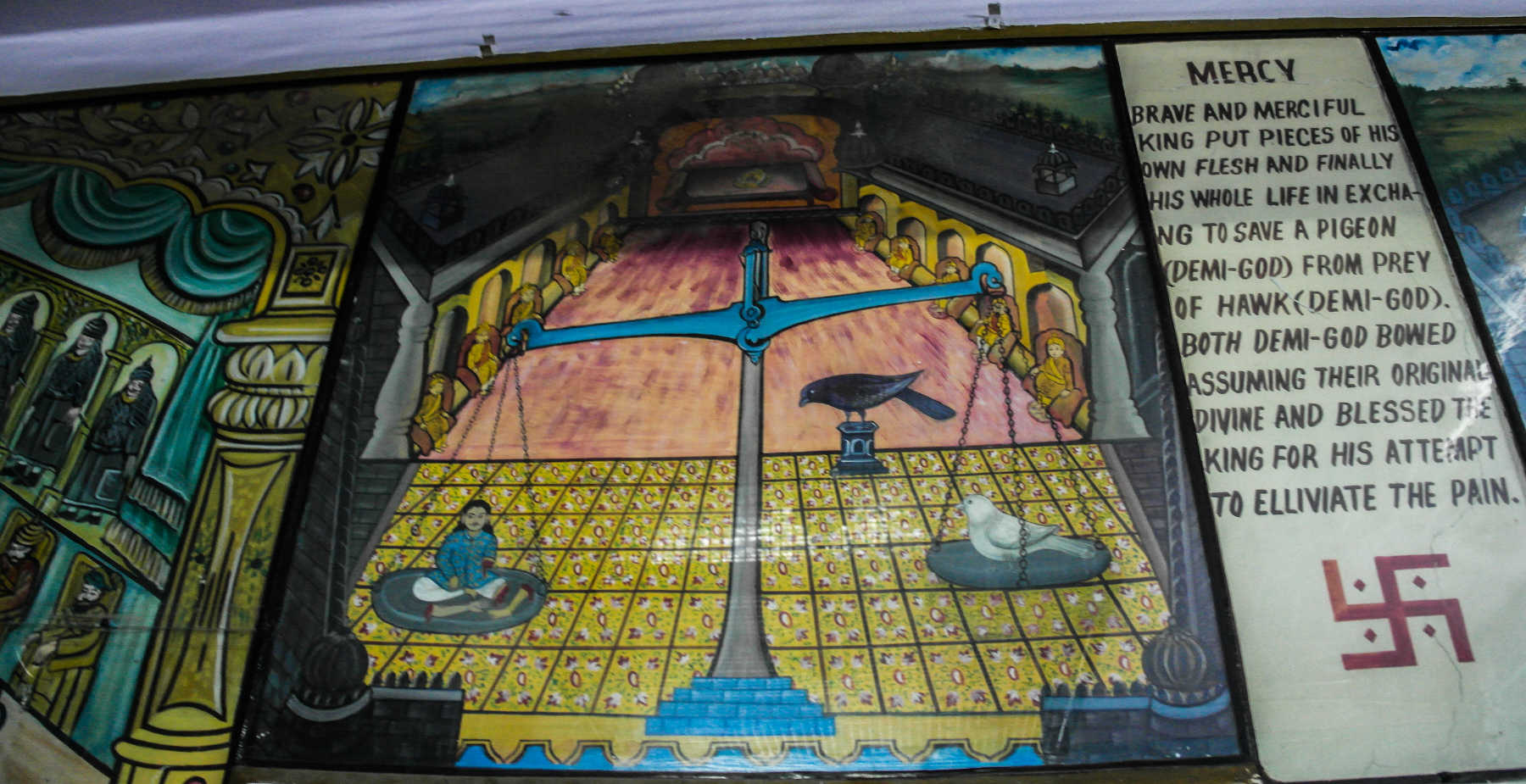 Im dritten Stock angekommen, öffne ich die Tür und betrete einen Raum, auch dieser voller Gemälde und mit bedeutungsvollen Geschichten, die an die Wände geschrieben sind. Ich bleibe stehen und lese. Ein Gemälde zeigt einen Mann und eine Taube auf einer Waage sowie einen Falken, der sie beide beobachtet. Daneben steht die folgende Geschichte: GNADE. Der mutige und gnädige König gab Teile seines eigenen Fleisches und schließlich sein ganzes Leben, um eine Taube (einen Halbgott) davor zu bewahren, zur Beute eines Falken (ebenfalls ein Halbgott) zu werden. Beide Halbgötter verneigten sich im Bewusstsein ihrer Göttlichkeit und segneten den König für seine Bemühung, den Schmerz zu lindern.