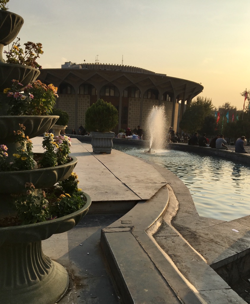Unser kleiner Spaziergang (okay, es könnte ein paar Stunden gedauert haben, aber die Zeit ist doch wie im Fluge vergangen, nicht wahr?) endet am Daneshjoo-Park vor dem Stadttheater (Teatr-e Shahr). Das letzte Mal war ich Mitte November 2017 dort: Ich hatte ein Gläschen Granatapfelkerne von einem Straßenverkäufer gekauft, saß ein paar Stunden am Brunnen und genoss den Sonnenuntergang und das milde Herbstwetter. Ich sah Studenten, Arbeiterinnen, ältere Frauen, alle in Schwarz gekleidet, oder Frauen in den Fünfzigern mit bunten Tüchern … Einige unterhielten sich, einige tranken Tee, andere hörten Musik, andere ruhten sich nur aus, ein Buch oder ein tasbih (Gebetsperlen) in den Händen, wieder andere beobachteten die Passanten …