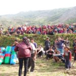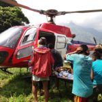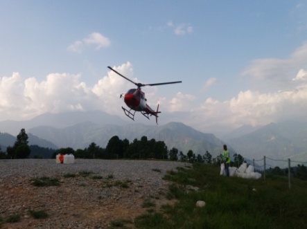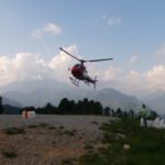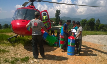 Inside the camp everything was ready for distribution. Now I was just counting the stones on the ground and waiting for the helicopter to come from Tribhuwan International Airport, Kathmandu. Suddenly, around 9:30 I could hear the approaching helicopter and finally it landed. There were other two guys, named Anton (Canadian) and Ricardo (Spanish) from SI to help me with the materials.