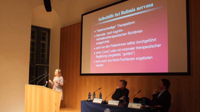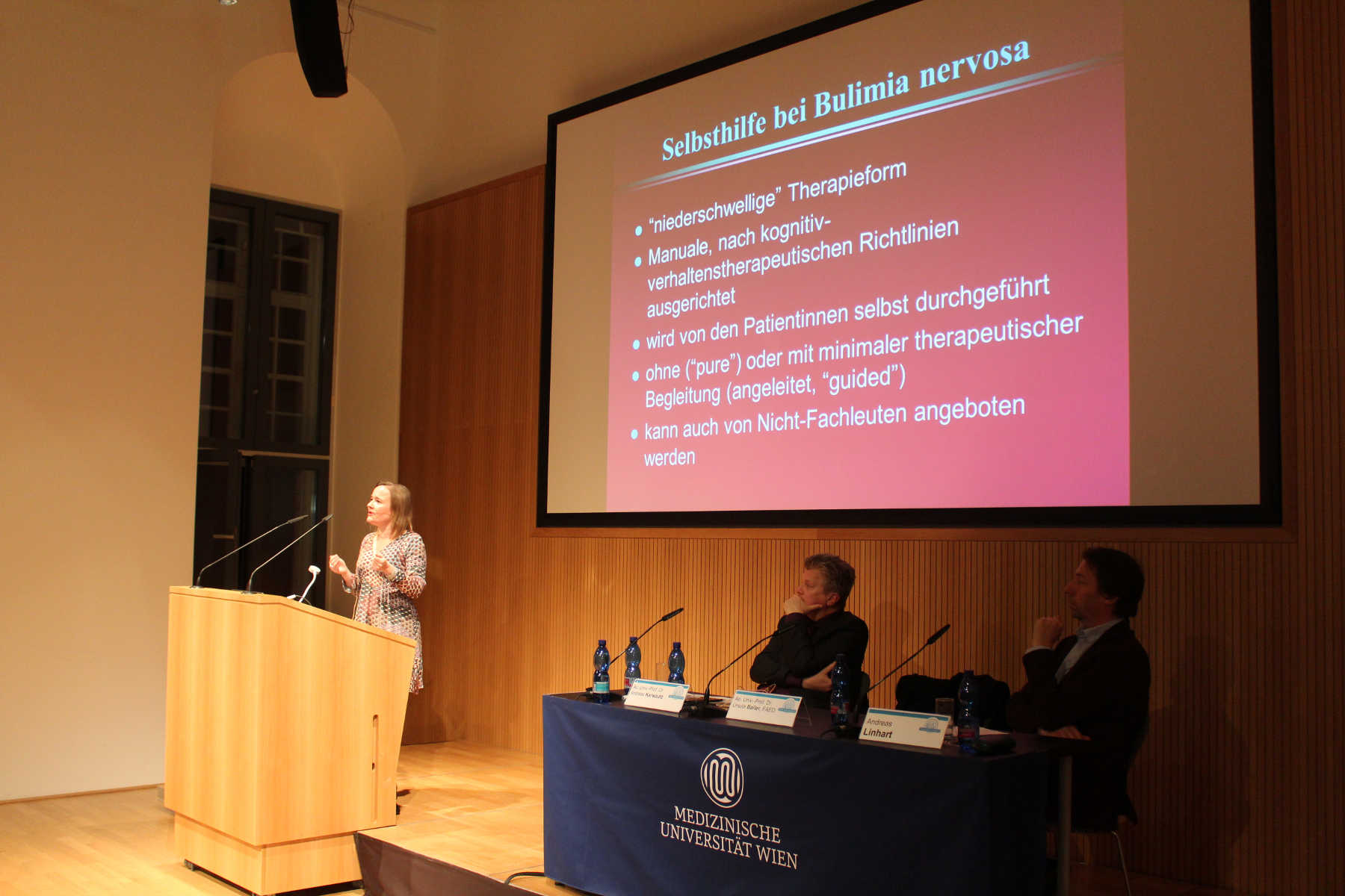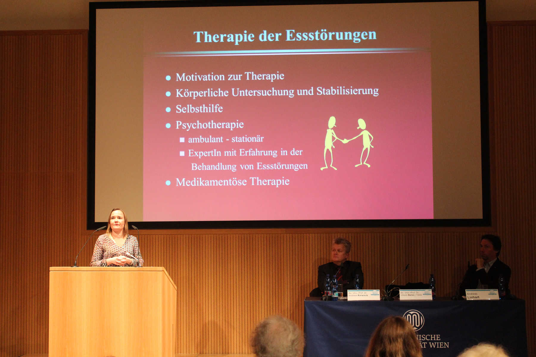 On the evening of February 22nd 2017, Prof. Ursula Bailer held the second part of the event with the title „Too little and too much – do we have a disturbed relationship to food?“ in the Van-Swieten Saal of the Medical University of Vienna. As head of the out-patient clinic for eating disorders of the Vienna General Hospital (since 2001), she focuses on eating disorders where “too much” food is consumed, in particular, therefore, bulimia nervosa and the binge eating disorder.