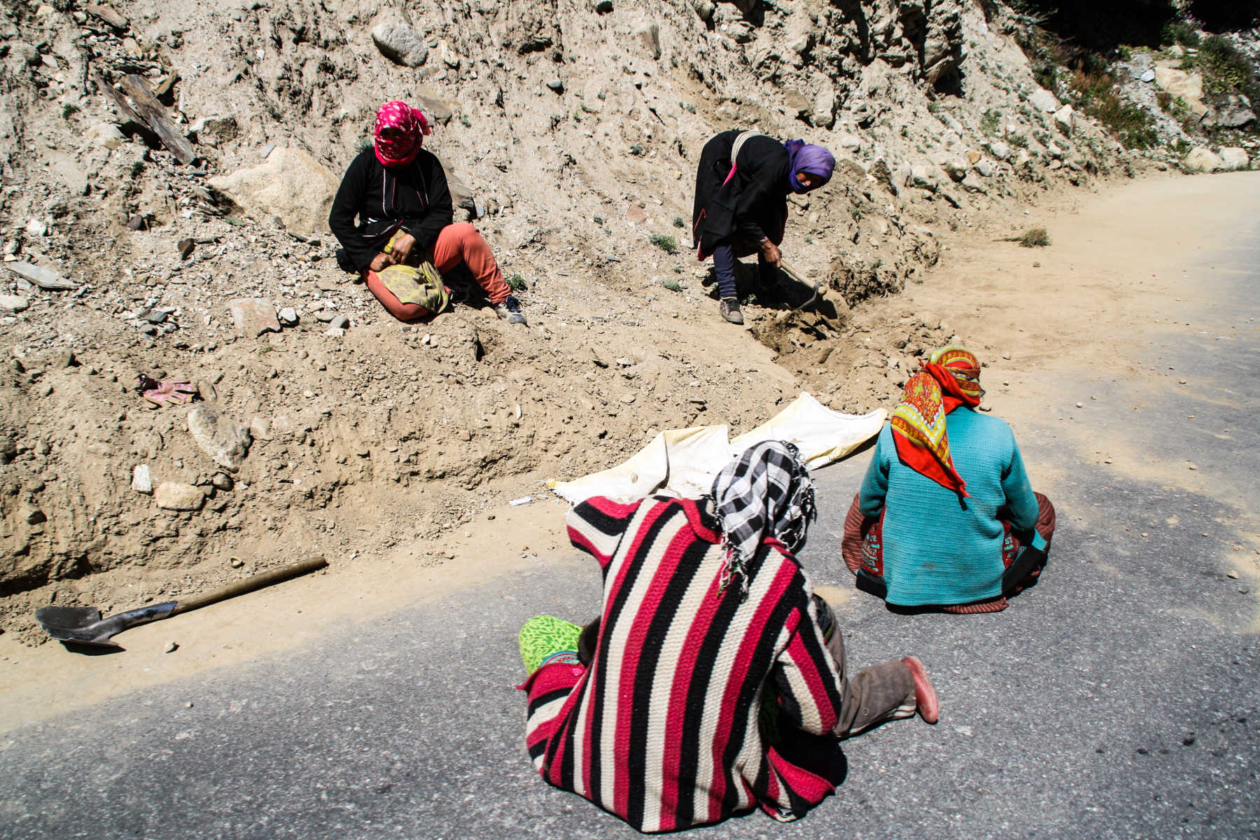Another surprising thing is that the road is in a much better condition than yesterday, but unfortunately not for a very long time. After driving for maybe one hour, we face our first problem; a big patch of the road has not been constructed at all, there is a pile of gravel with sand on top, creating a lot of dust and a very slippery road. We are driving behind a petrol truck and all the dust comes in our face, making it almost impossible to breathe or see anything.