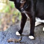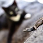 On a rock we spotted a cat, which had its eye on a lizard. The Reptile had already dropped its tail and feared for its life, while the cat was having fun playing with it.