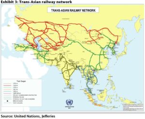 The Trans-Asian Railway Network, an idea of the UN from the 1950s, has received considerable attention again because of China’s ambitious plans. Meanwhile cargo transports from Hamburg to Beijing take no more than fifteen days. When completed, the ride will take ten days. A ship used to require about twice the time for the same haul, including stops.