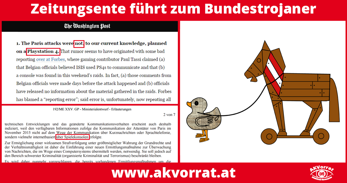 Today, the AK Vorrat published their statement on Minister of Justice Brandstetter’s proposal to introduce a governmental monitoring software (Federal Trojan). The detailed legal and technical statement shows, why this ad hoc legislation causes more problems than it can solve.
