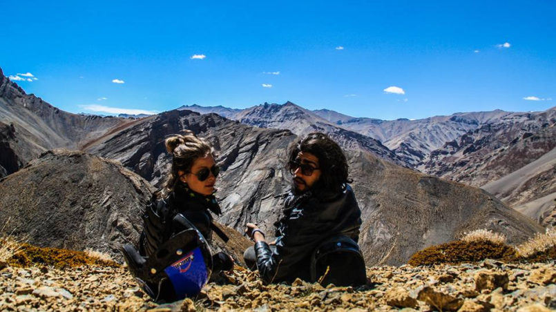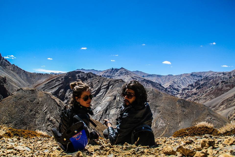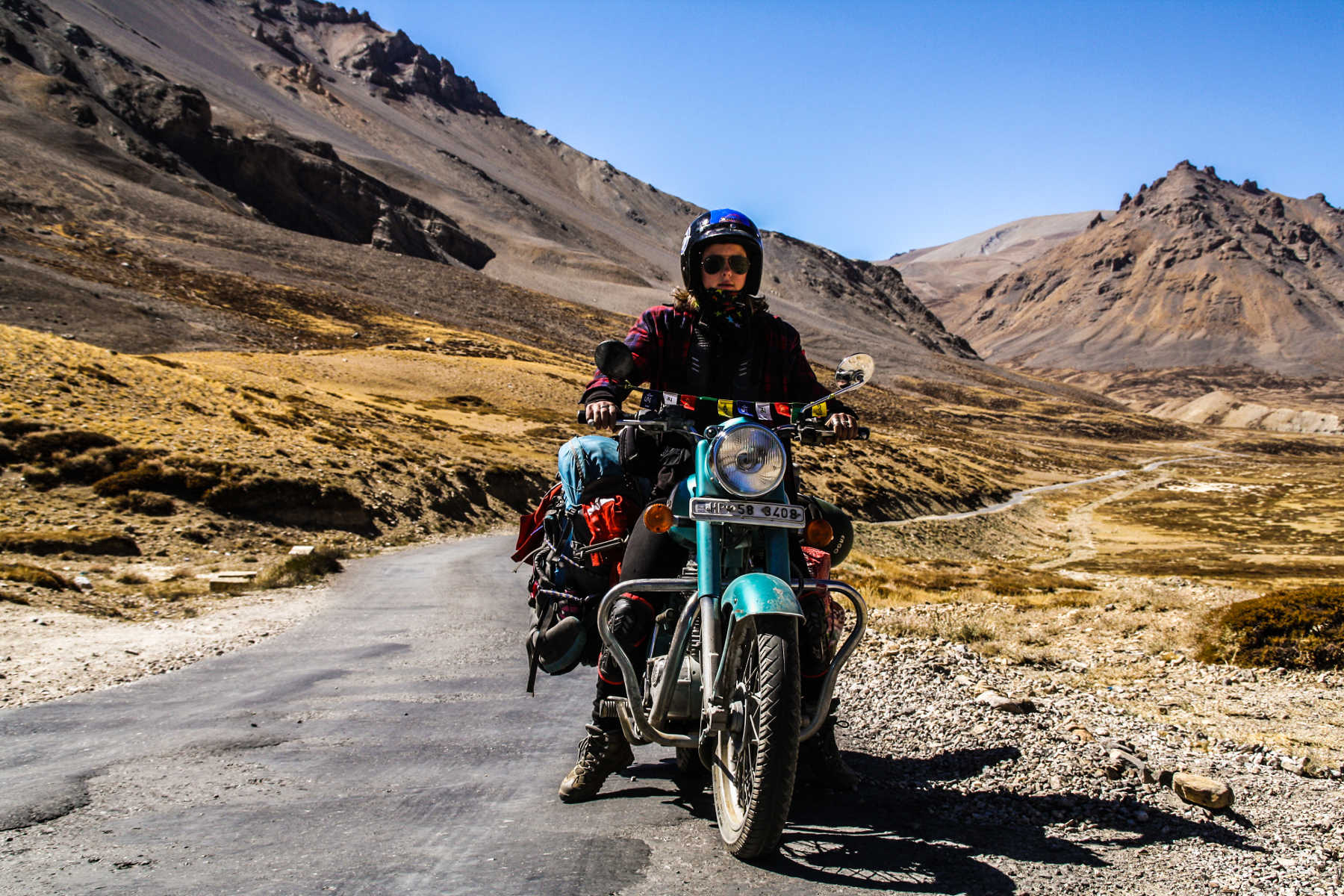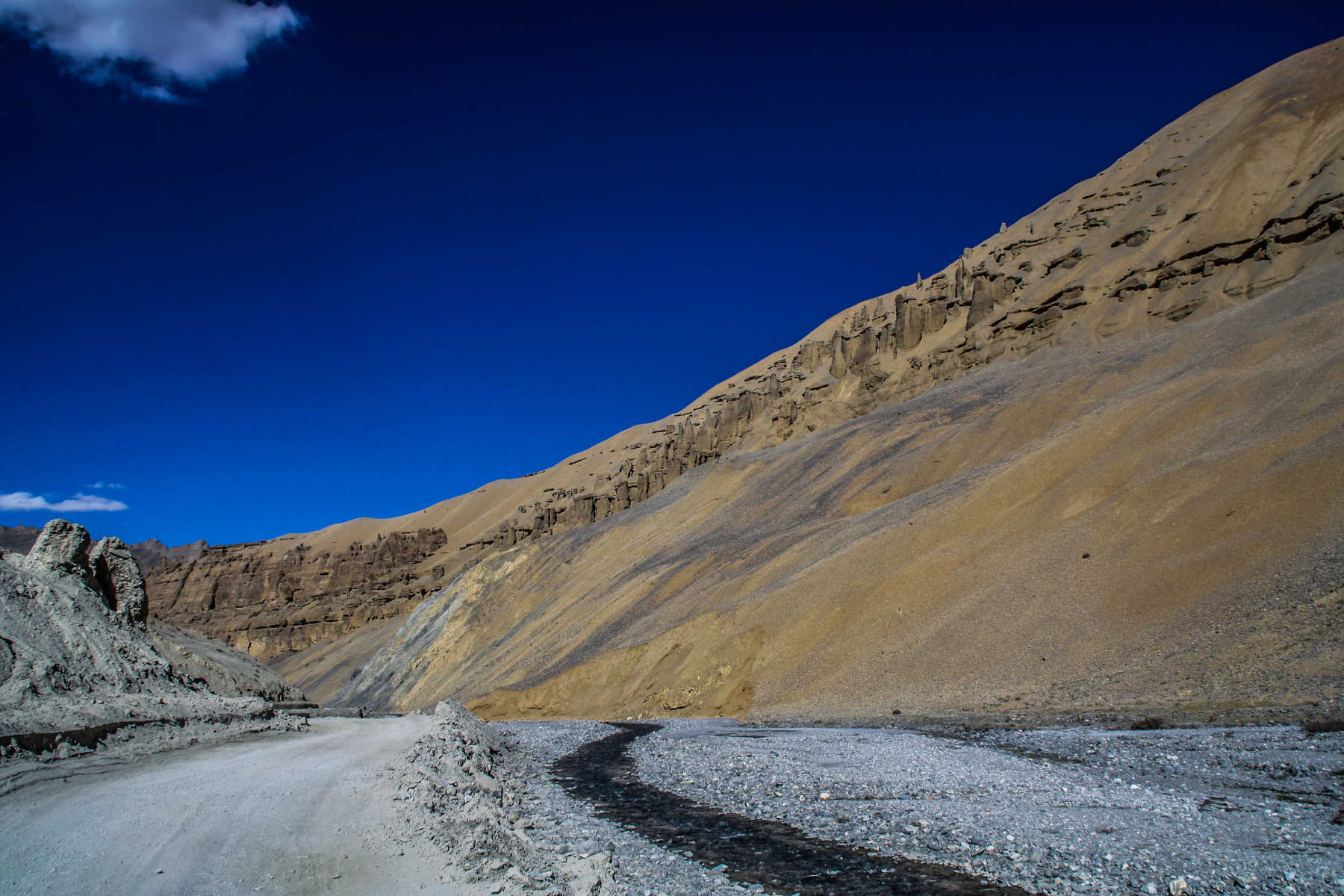 Aber leider verkalkulierten wir uns mit der Kraft des Motorrads, der Steilheit und dem Untergrund, der wie weißes Mehl aussieht und sehr wenig Bodenhaftung ermöglicht. Und so bricht das Motorrad aus und beginnt zurückzurutschen – und es kommt zu unserem ERSTEN STURZ. Es geht alles sehr schnell, mir wird schwarz vor den Augen und schon liege ich am Boden. Ich stehe ein bisschen unter Schock, aber trotzdem checke ich sofort ab, ob meine Gelenke heil sind oder ob sogar Blutungen vorhanden sind – zugleich frage ich Sourabh, ob er okay ist. Zum Glück sind wir beide heil – bis auf die Tatsache, dass ich mein Handgelenk verletzt habe und voller Staub bin. Ein LKW-Fahrer, der den Vorfall beobachtet hat, hält neben uns an und erkundigt sich nach unserem Befinden – wir nicken einfach nur.