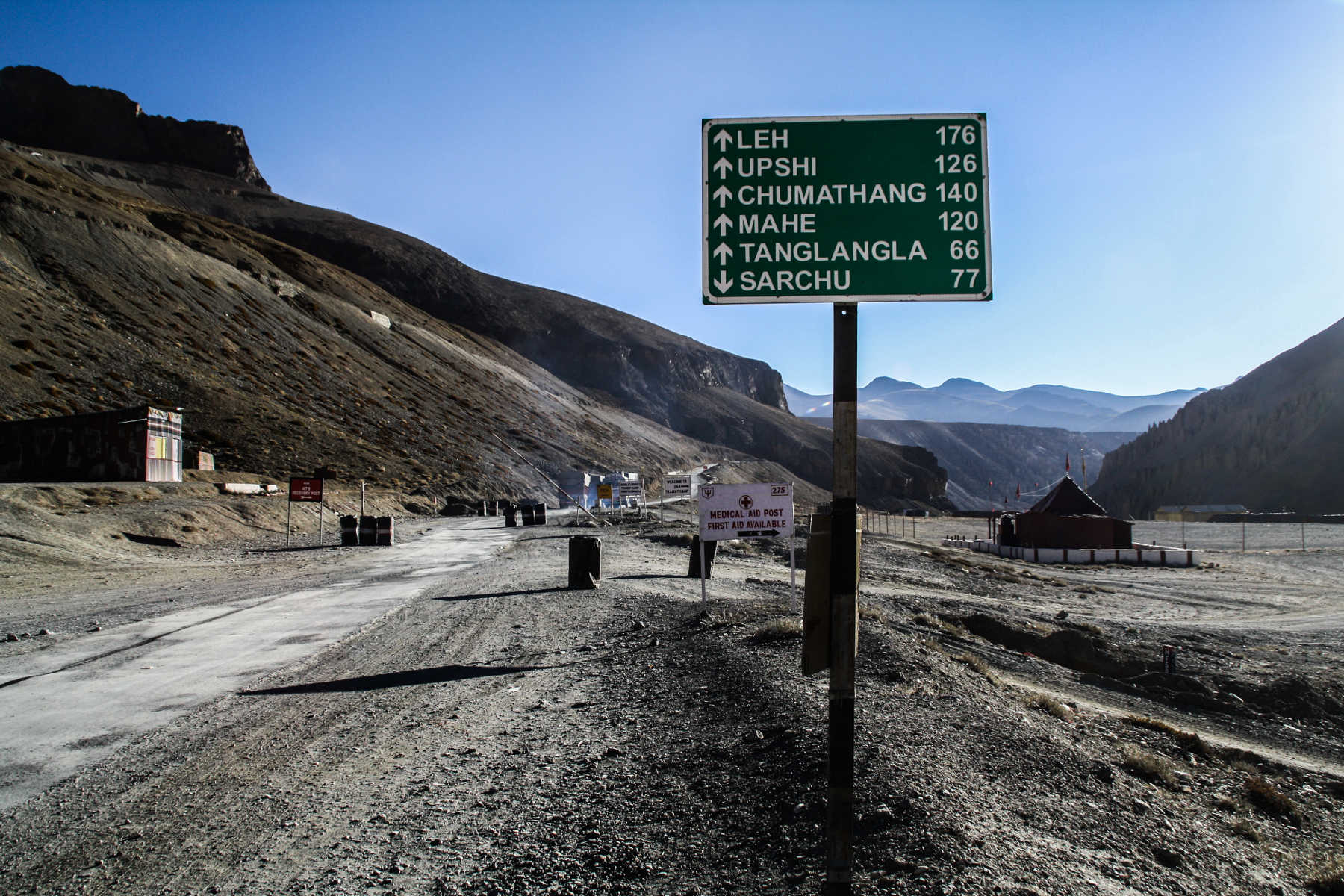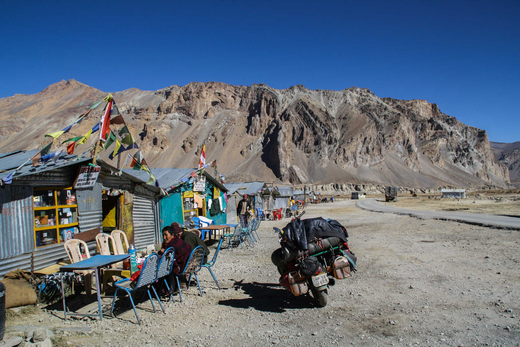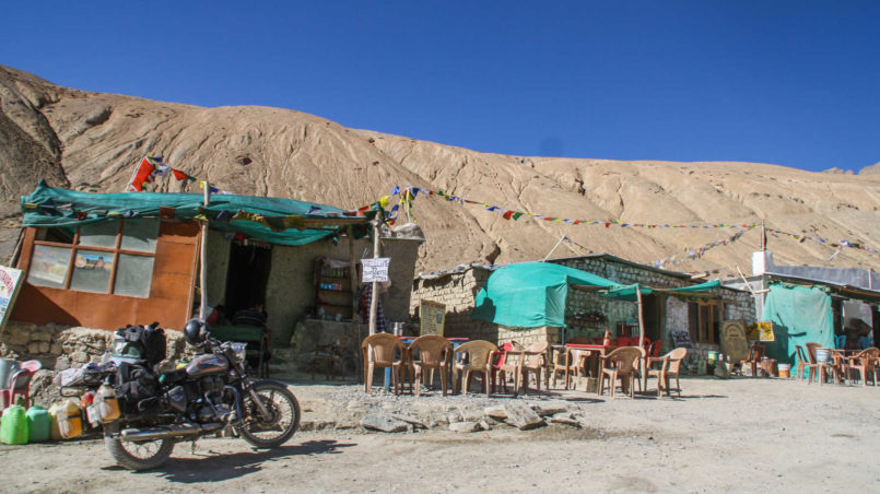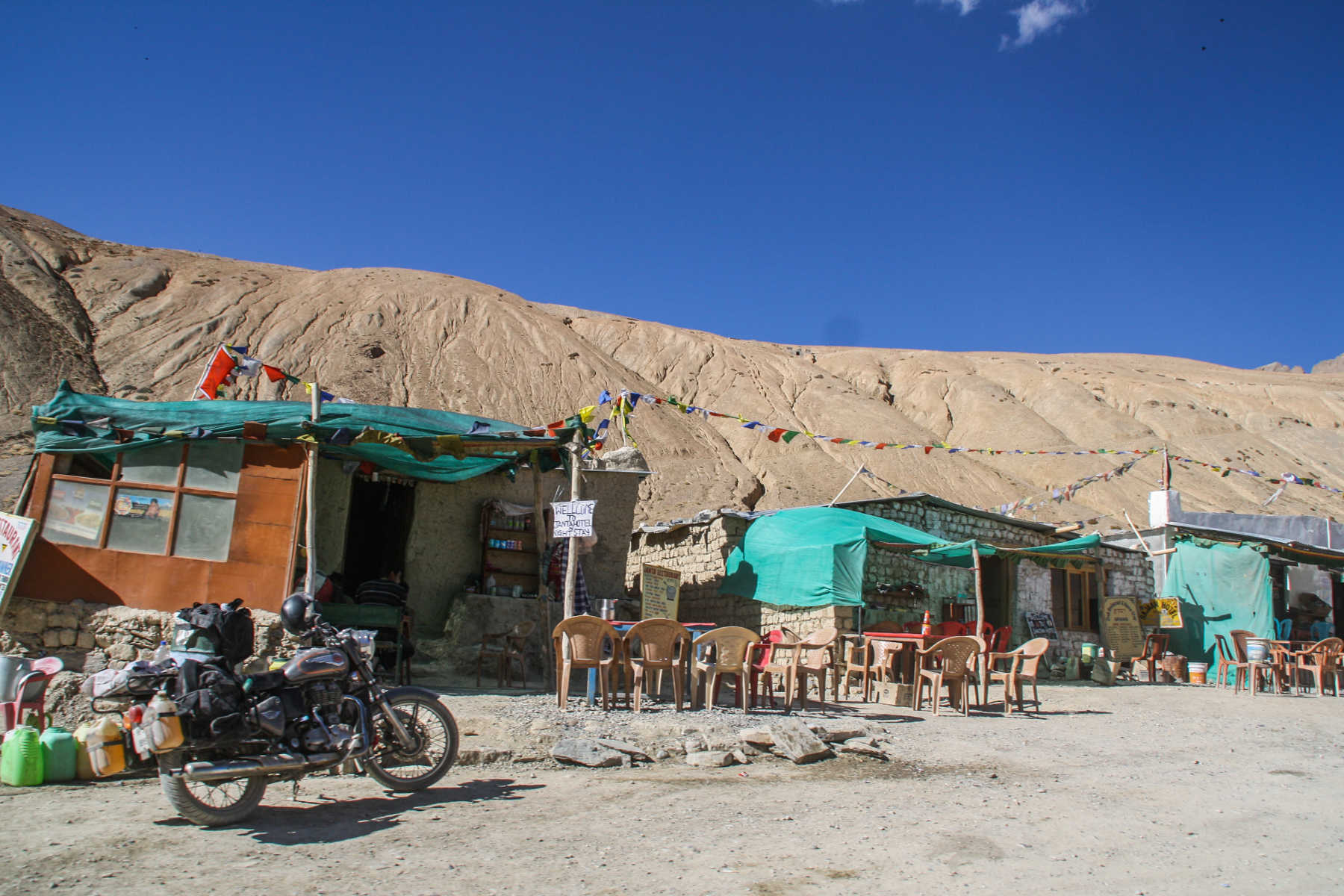 Zuerst begebe ich mich auf die Suche nach einem „Waschraum“, der sich in der Nähe des Dhaba befindet. Danach trinke ich genüsslich einen heißen Chai mit einem Omelett-Brot. Da es zwischen Sarchu und Leh nur einen einzigen Zwischenstopp gibt, nämlich Pang auf 4.700 m Höhe, und es aufgrund der Höhenlage nicht empfehlenswert ist, dort auch zu übernachten, haben wir geplant, Leh heute zu erreichen – und Leh ist stolze 250 km von hier entfernt.