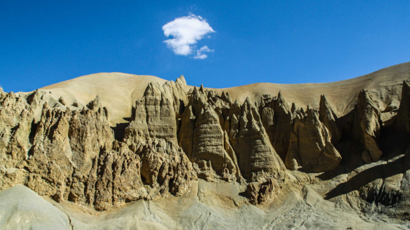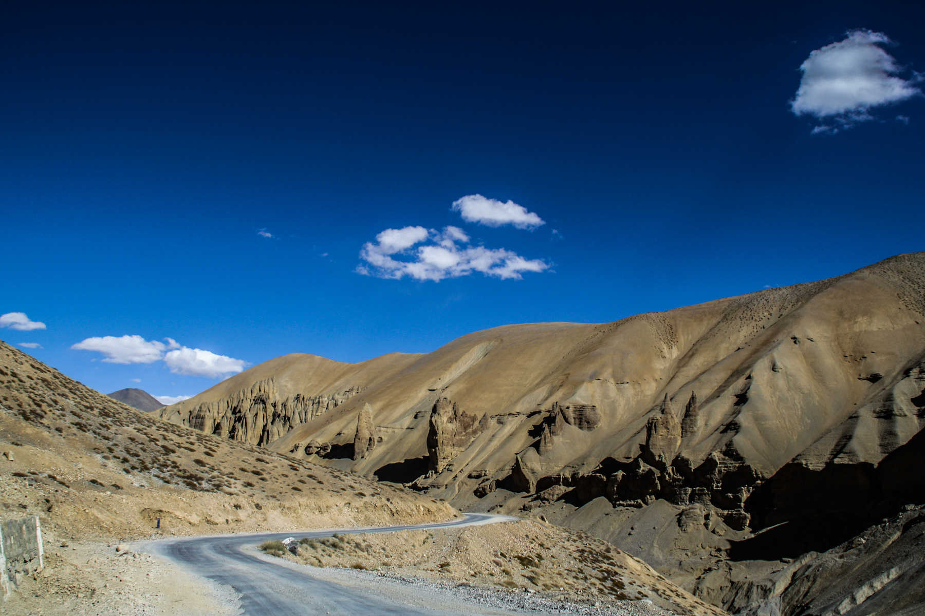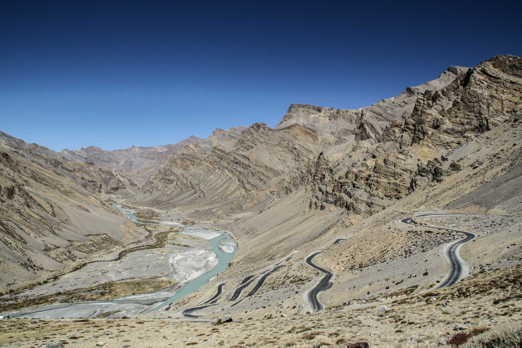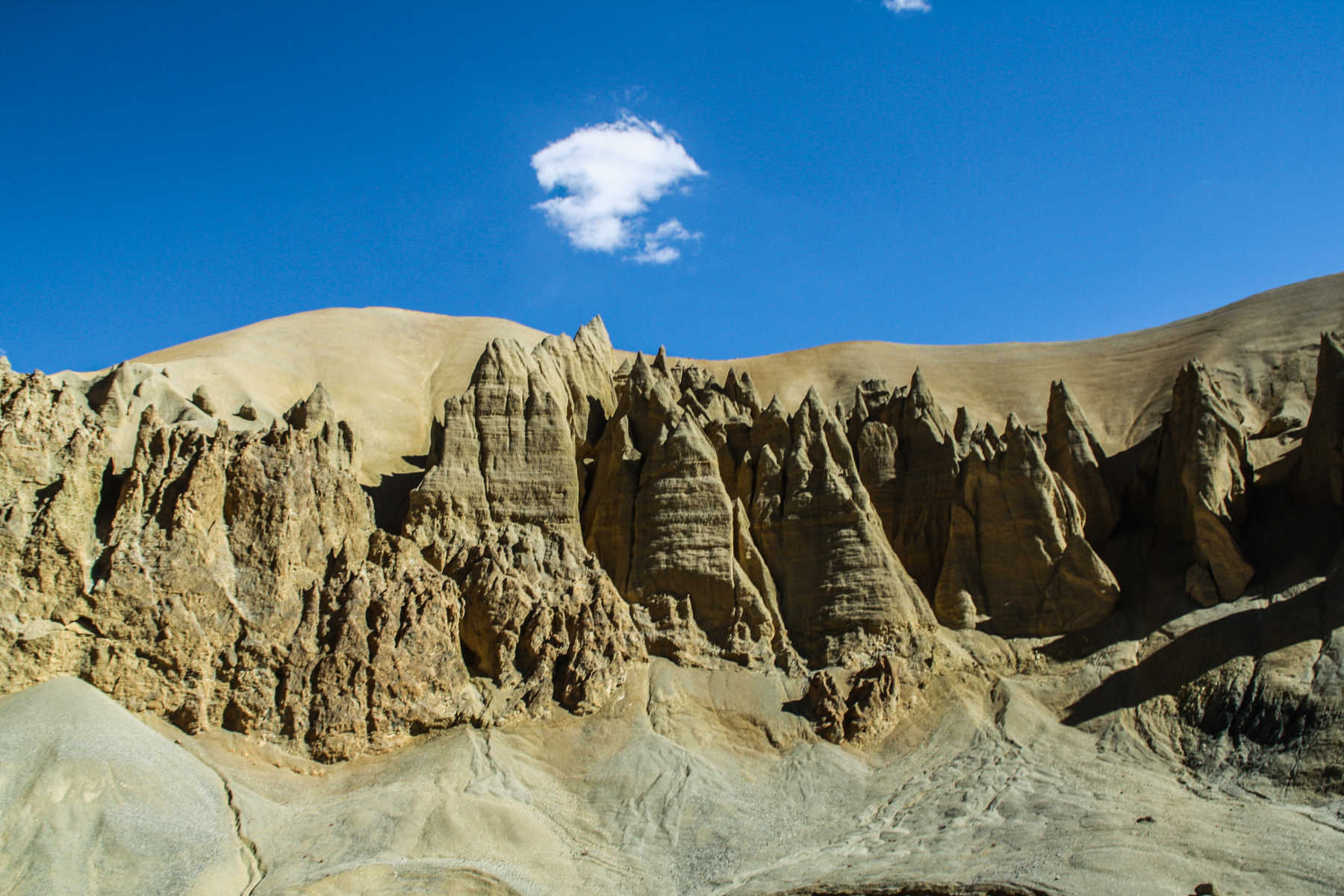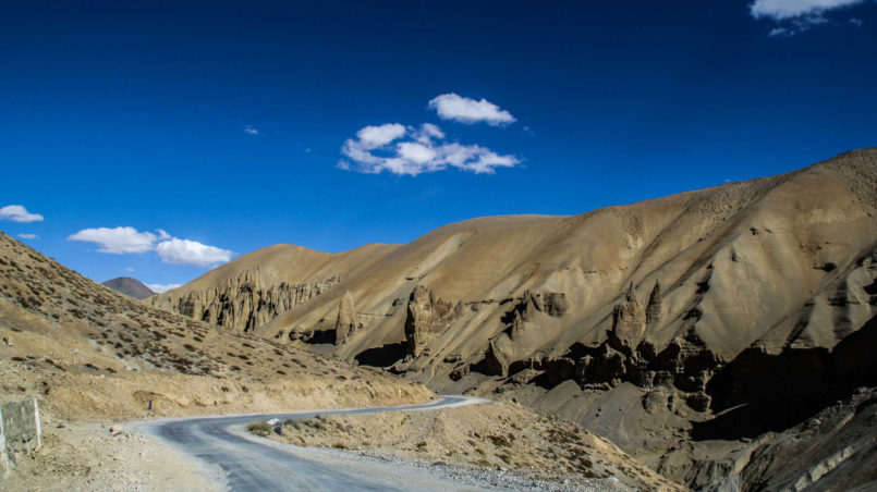 Kurz danach müssen wir eine kurze Straße bewältigen, bei der uns bange zumute wird: Sie ist extrem schmal und kurvig, und die Klippe ist sehr steil. So steil, dass ich mich nicht einmal runterzuschauen traue. Ironischerweise weiß ich zu diesem Zeitpunkt noch nicht, dass die schlimmste Straße noch vor uns liegt. Ich versuche, cool zu bleiben, indem ich auf die andere Straßenseite schaue, um so Sourabh, der fährt, nicht zu beunruhigen. Glaubt mir, das war gar nicht angenehm. Nachdem wir diesen argen Hang geschafft haben, halten wir an und fassen uns, um durchzuatmen und betrachten die faszinierenden Felsformationen vor uns.