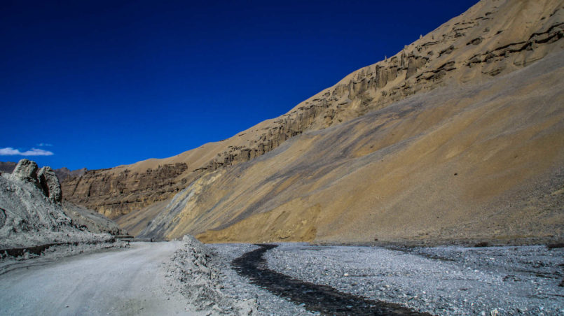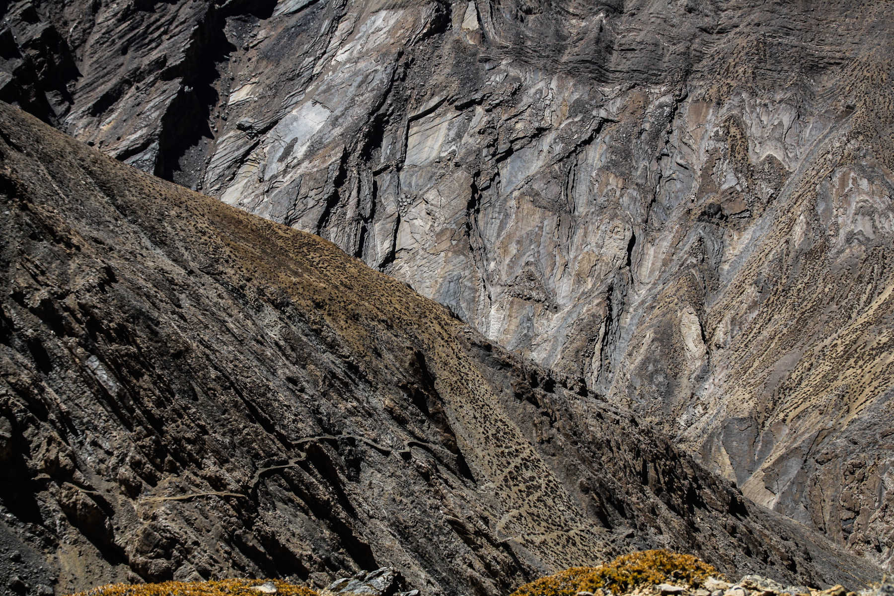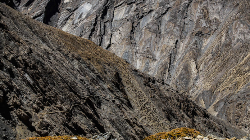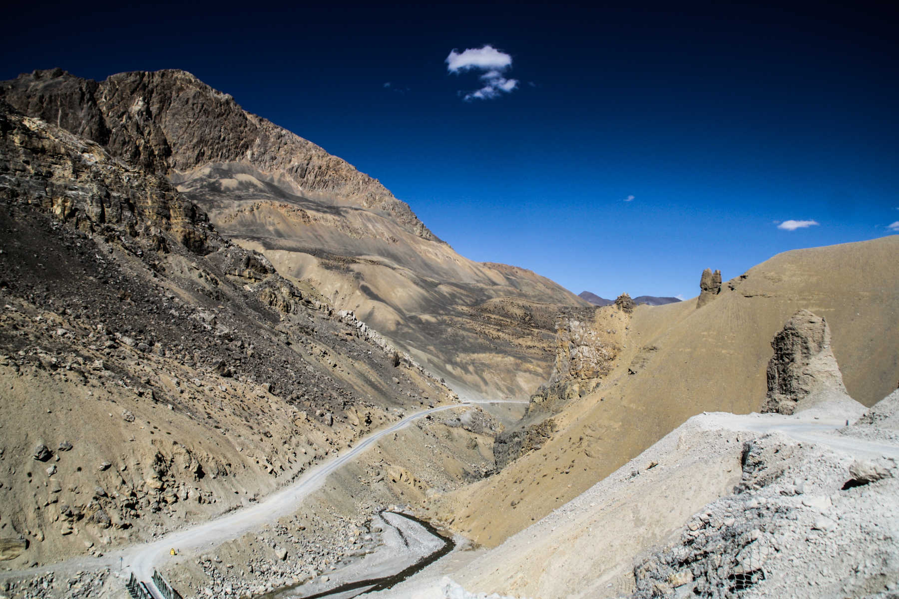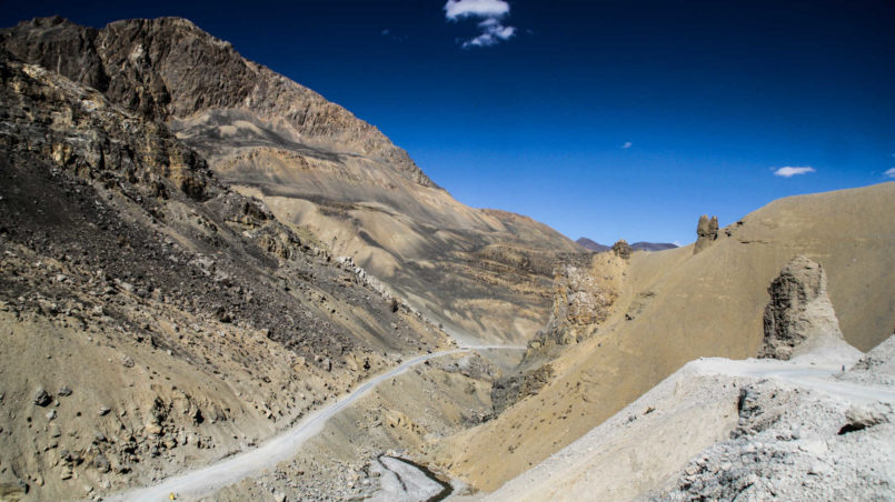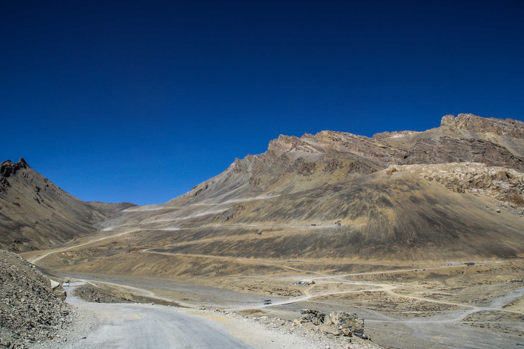 Weiter geht es mit unserer Fahrt in ein sehr trockenes Tal. Wieder müssen wir in Kehren zum Gipfel (Lachlung La – 5.059 m) hinauf, diesmal allerdings sind diese weitläufiger. Um die Strecke abzukürzen und die Sache etwas abenteuerlicher zu machen, haben ein paar Leute mit Geländewagen Abkürzungen ausgefahren, mit denen eine 1 km lange Kehre leicht auf eine 200 m lange steile Strecke reduziert werden kann. Da diese Abkürzungen sehr verlockend sind, haben wir uns auch für eine entschieden.