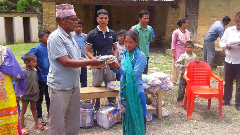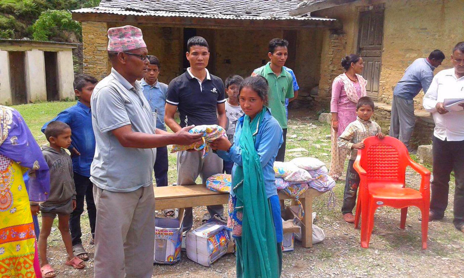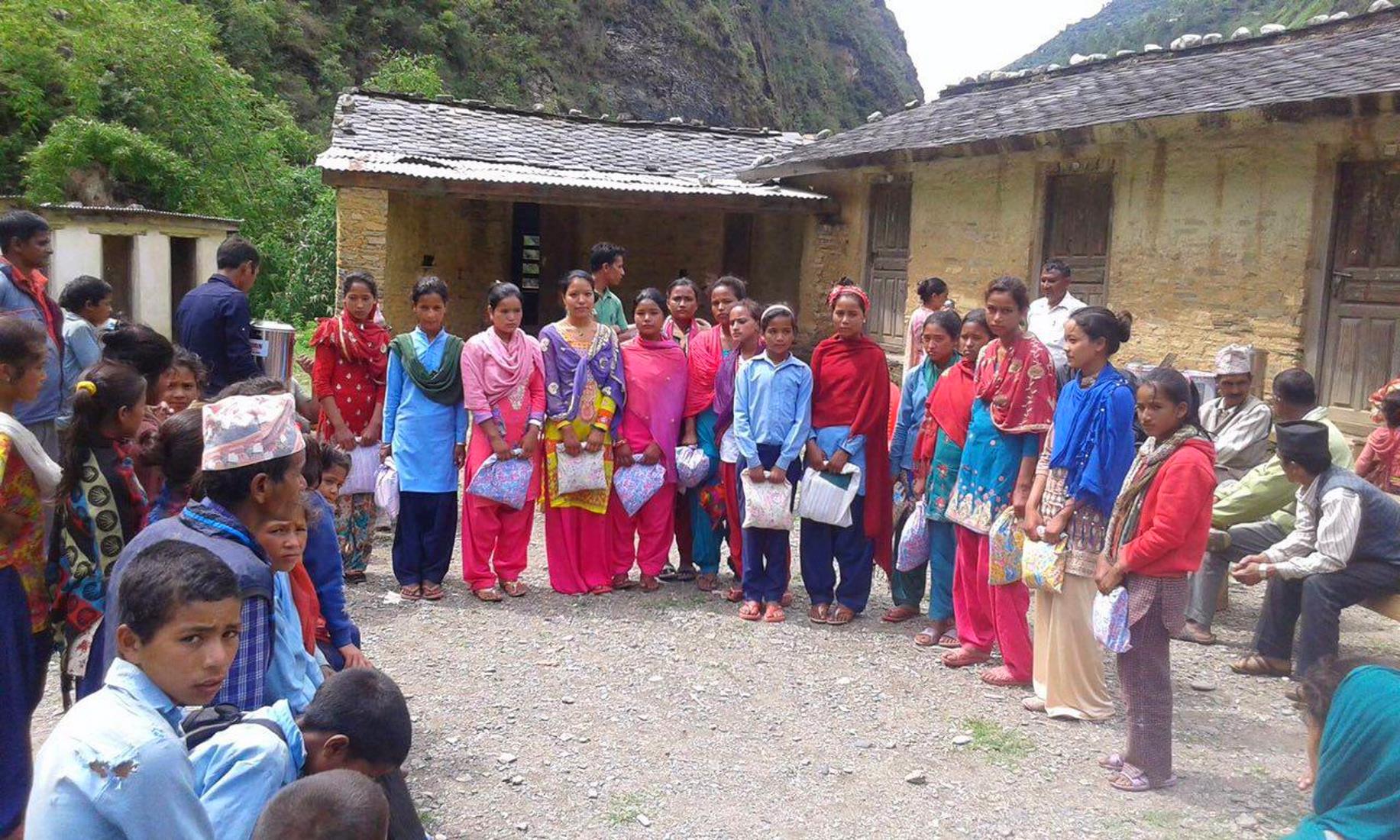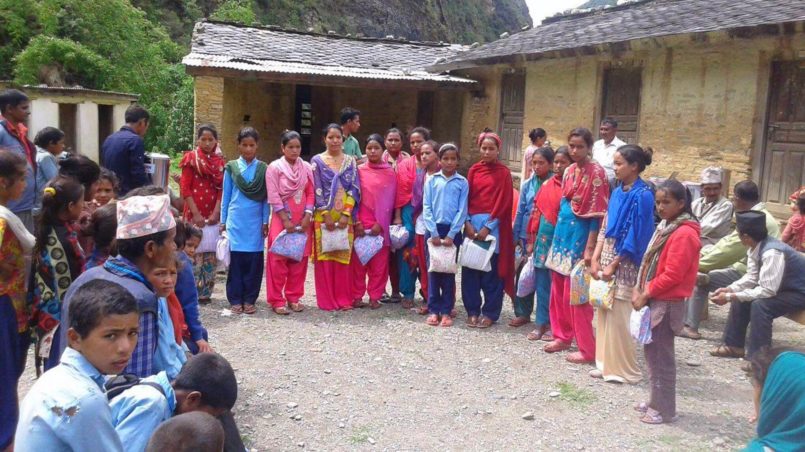 Am 15. Juni schließlich wurden die Hygienesets vom Bezirksvorsteher, Man Bahadur Singh, an die fünfzehn Mädchen der fünf verschiedenen Schulen übergeben, und ihre Schulen erhielten die Wasserfilter.