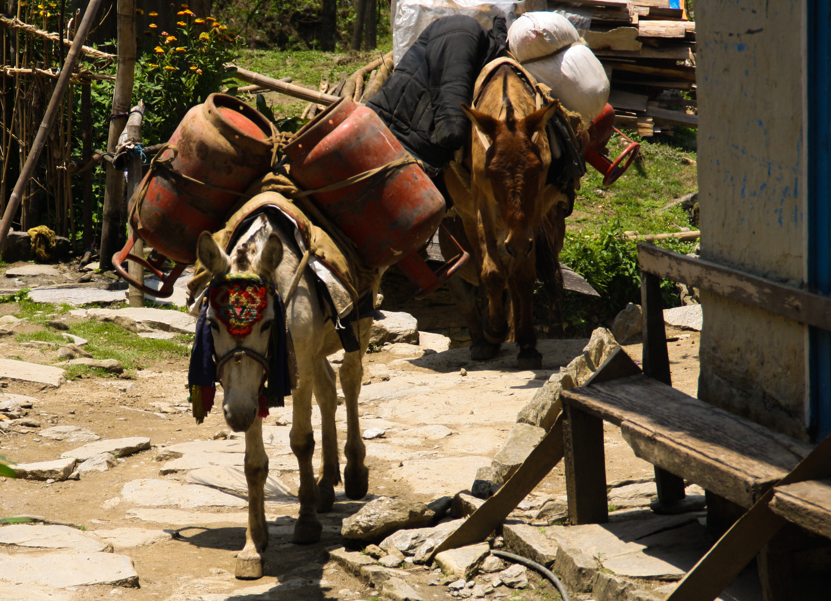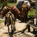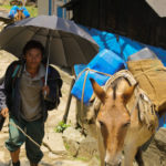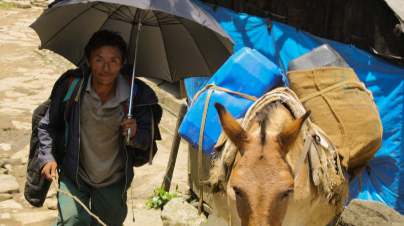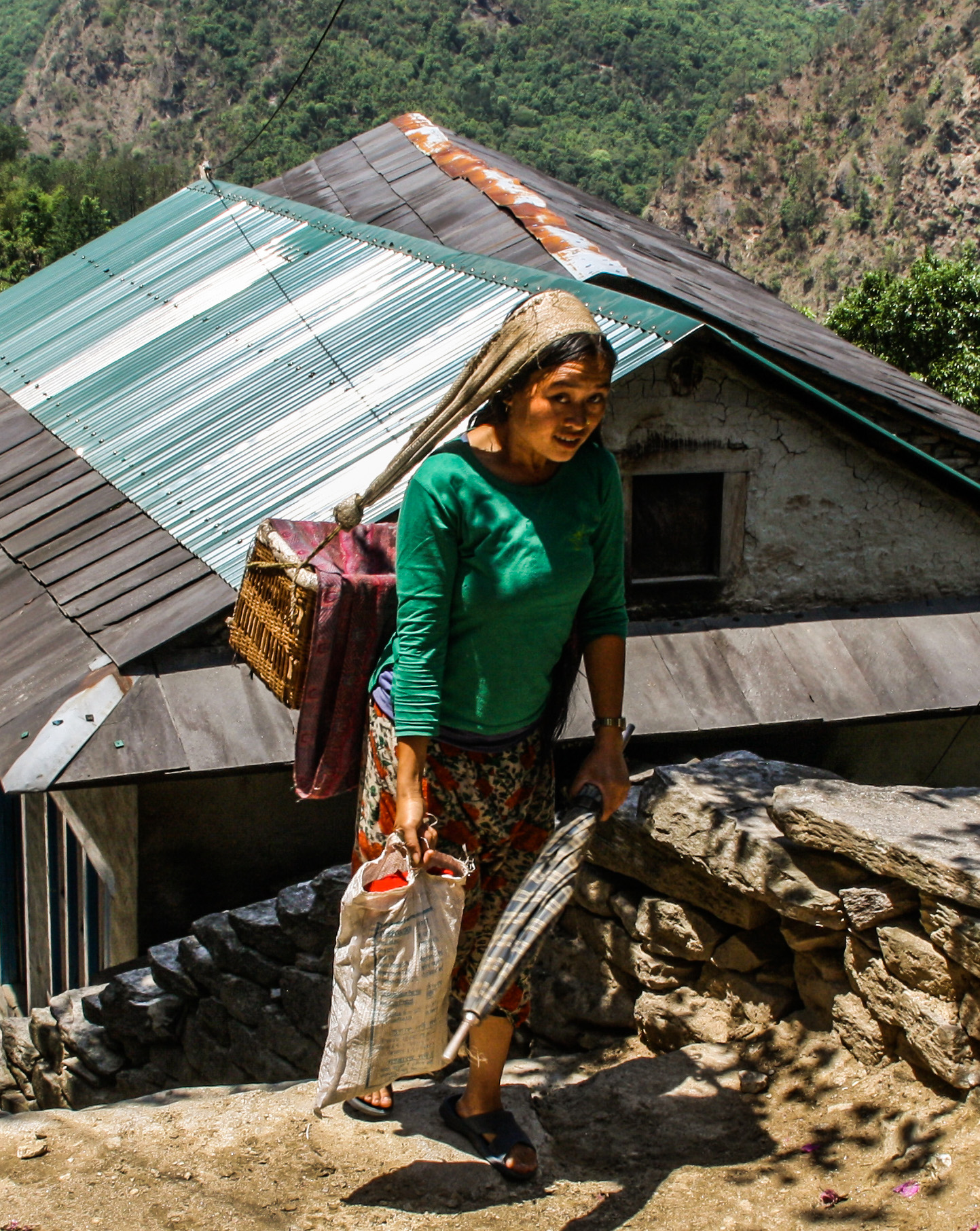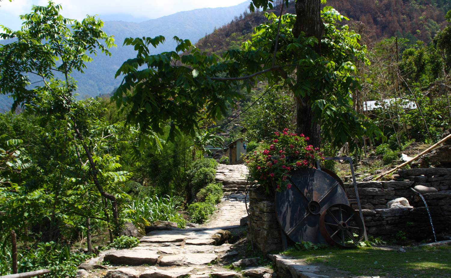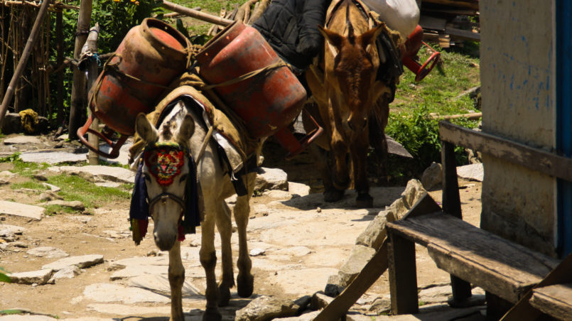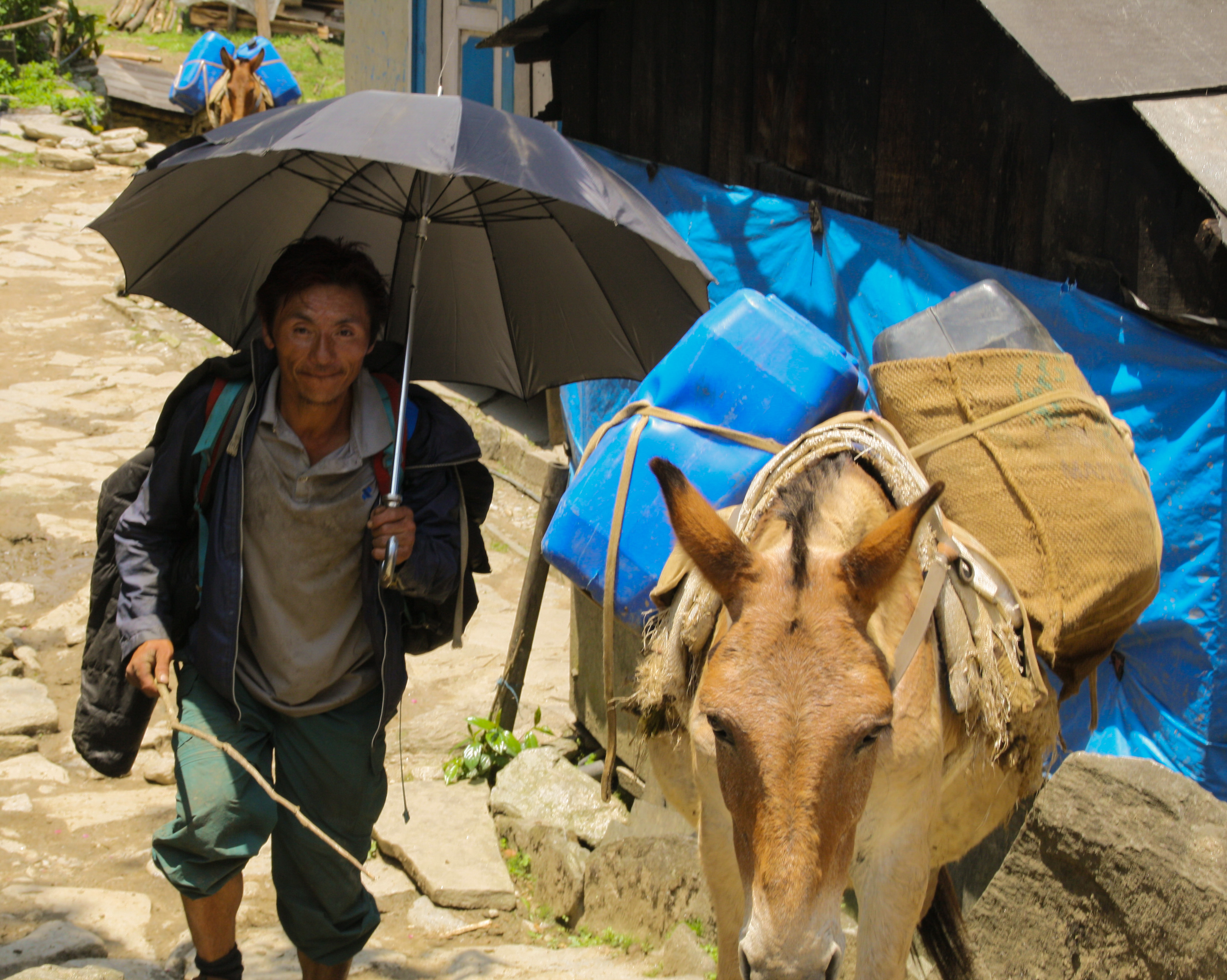 Es ist höchste Zeit, aufzustehen. Ich eile die Stufen hinunter, um mir meine Kleidung zu holen – ich habe sie in der Nacht zum Trocknen aufgehängt, und so konnte sie wohl nicht trocken werden. Also hänge ich die nassen Kleider auf meinem Wäscheständer auf (das ist in diesem Fall mein Rucksack – man lernt sehr schnell, in den Bergen zu improvisieren!). Ich hoffe auf die warme Morgensonne, die bitte alles in Null-Komma-Nichts trocknen lassen solle. Die Wanderung ins Tal ist sehr fein und es regnet nicht. Als wir aber den Fluss erreichen, wissen wir eins ganz genau: Diesen Weg müssen wir wieder hinaufklettern; und so beschaffen wir uns Bambusstöcke, die uns für die Wanderung einen guten Dienst erweisen. Nun erreichen wir eine Hängebrücke – das war für mich das erste Mal, so eine Brücke überhaupt zu Gesicht zu bekommen. Ich bin derart in meinen Gedanken vertieft und lausche meiner Musik, dass ich gar nicht die ganze Herde Esel hinter mir bemerke, die so wie ich die Brücke überqueren möchte. Das Teil schaukelt und ich möchte schon auf dem Absatz kehrt machen – doch das geht natürlich nicht. Also fasse ich meinen gesamten Mut zusammen und gehe einfach weiter, mit dem Blick nach vorne – und bete, dass ich nicht hinunterfalle. Am anderen Ende der Brücke sehe ich nepalesische Frauen, die über diesen Vorfall kichern und lachen. Als ich nun sicher am anderen Ende lande, schlägt mein Herz so schnell und ich muss mich hinsetzen – ganz zum Amusement der einheimischen Damen hier …