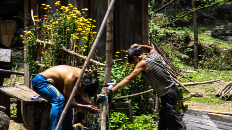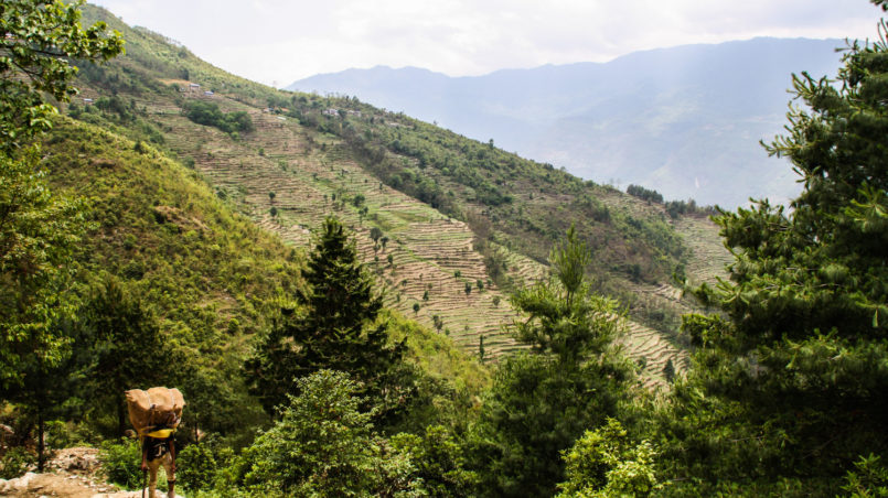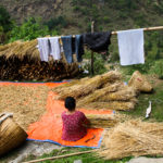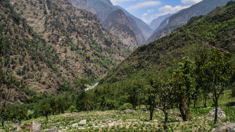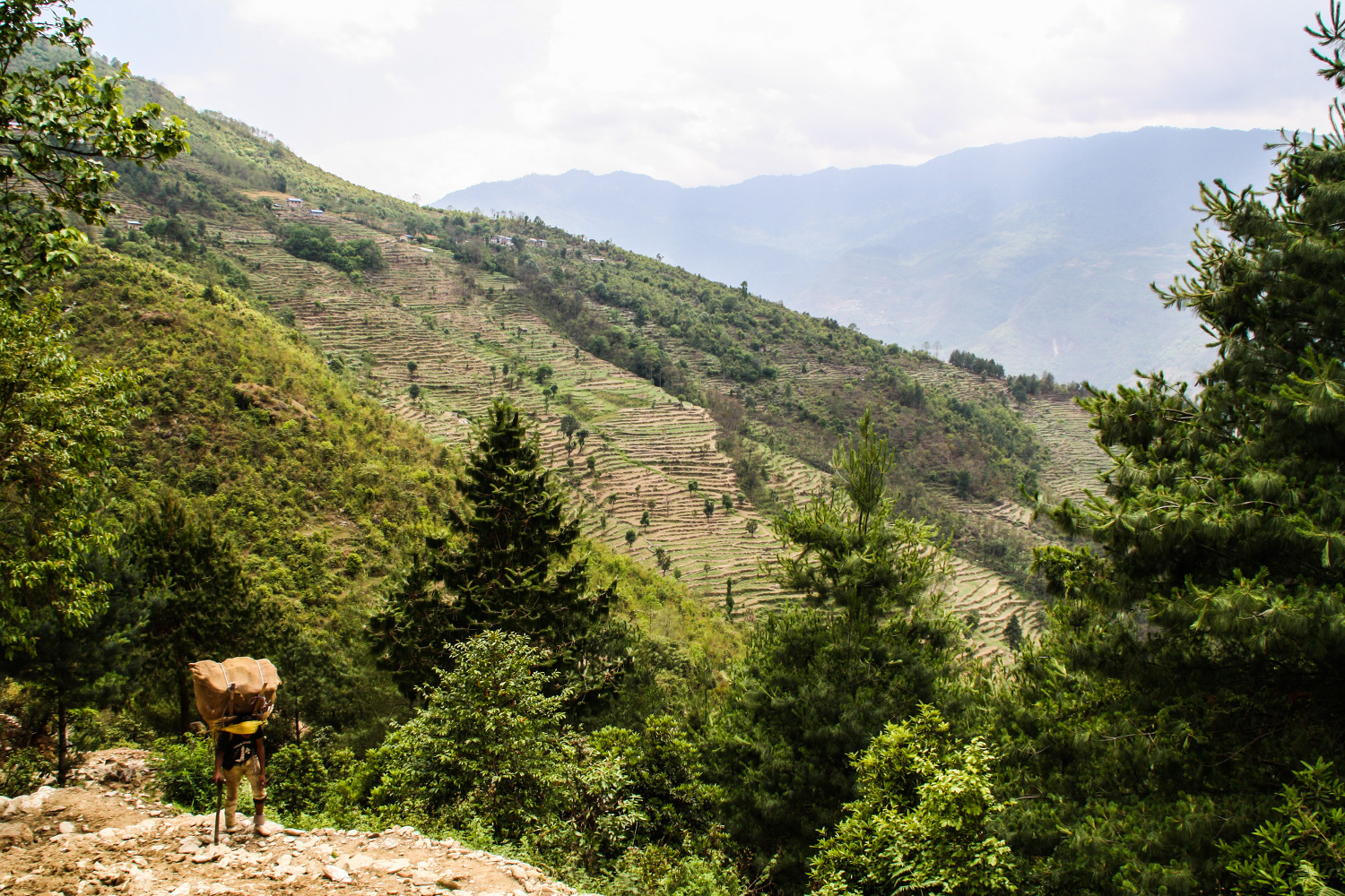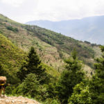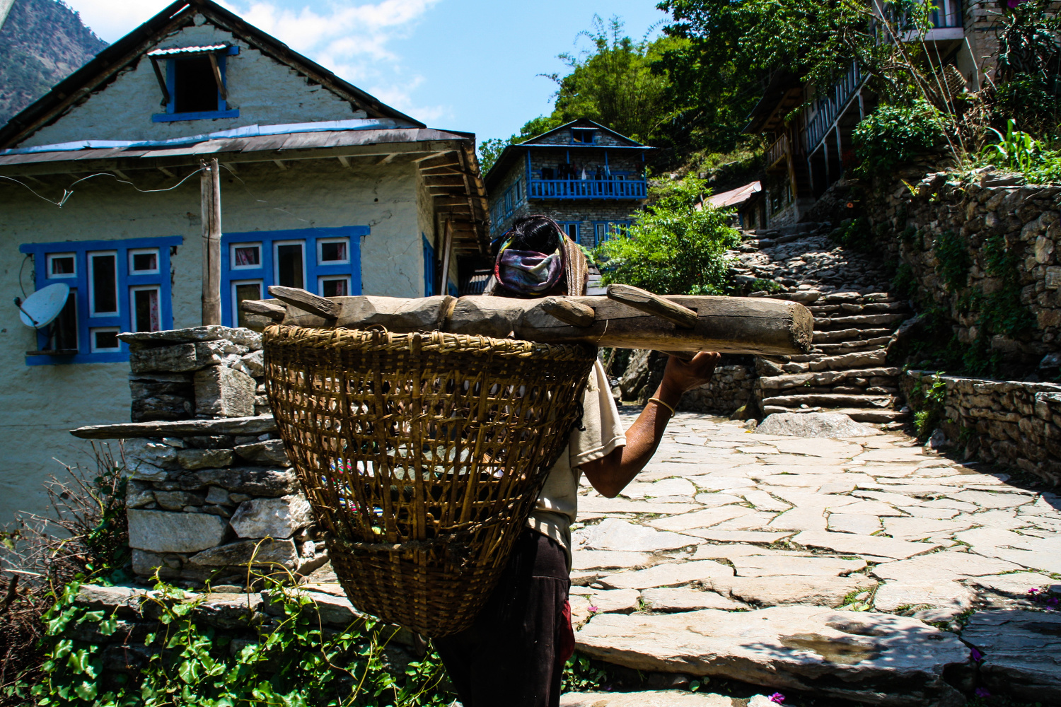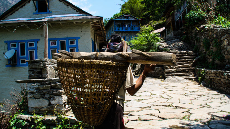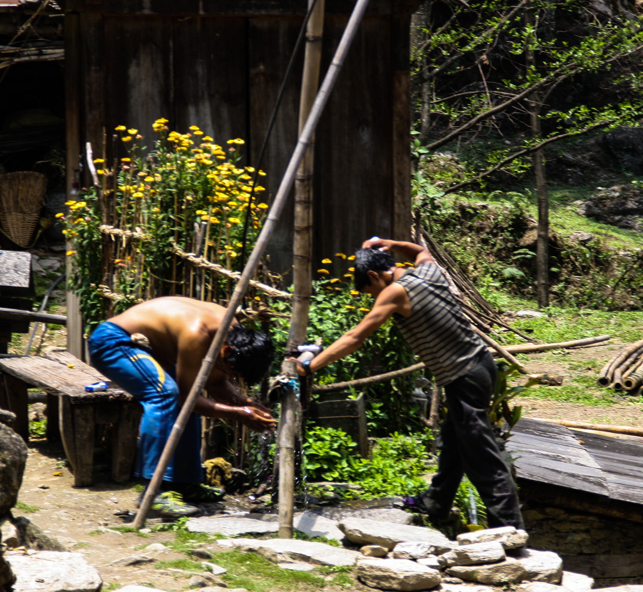 Es ist höchste Zeit, aufzustehen. Ich eile die Stufen hinunter, um mir meine Kleidung zu holen – ich habe sie in der Nacht zum Trocknen aufgehängt, und so konnte sie wohl nicht trocken werden. Also hänge ich die nassen Kleider auf meinem Wäscheständer auf (das ist in diesem Fall mein Rucksack – man lernt sehr schnell, in den Bergen zu improvisieren!). Ich hoffe auf die warme Morgensonne, die bitte alles in Null-Komma-Nichts trocknen lassen solle. Die Wanderung ins Tal ist sehr fein und es regnet nicht. Als wir aber den Fluss erreichen, wissen wir eins ganz genau: Diesen Weg müssen wir wieder hinaufklettern; und so beschaffen wir uns Bambusstöcke, die uns für die Wanderung einen guten Dienst erweisen. Nun erreichen wir eine Hängebrücke – das war für mich das erste Mal, so eine Brücke überhaupt zu Gesicht zu bekommen. Ich bin derart in meinen Gedanken vertieft und lausche meiner Musik, dass ich gar nicht die ganze Herde Esel hinter mir bemerke, die so wie ich die Brücke überqueren möchte. Das Teil schaukelt und ich möchte schon auf dem Absatz kehrt machen – doch das geht natürlich nicht. Also fasse ich meinen gesamten Mut zusammen und gehe einfach weiter, mit dem Blick nach vorne – und bete, dass ich nicht hinunterfalle. Am anderen Ende der Brücke sehe ich nepalesische Frauen, die über diesen Vorfall kichern und lachen. Als ich nun sicher am anderen Ende lande, schlägt mein Herz so schnell und ich muss mich hinsetzen – ganz zum Amusement der einheimischen Damen hier …