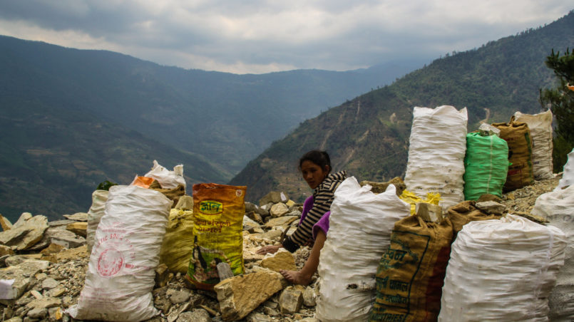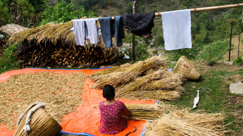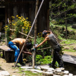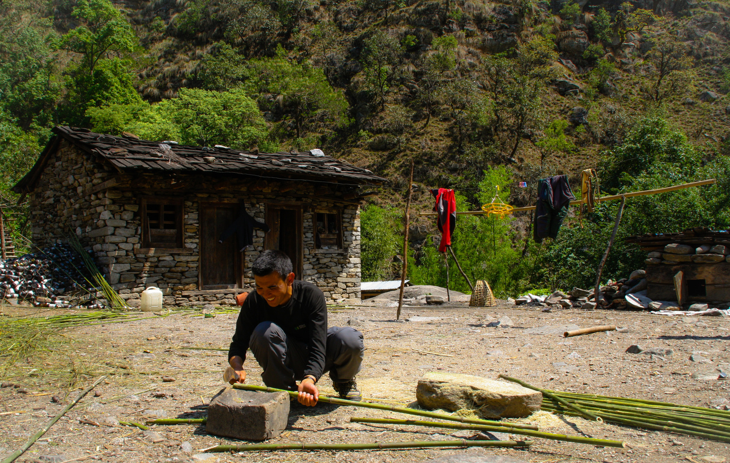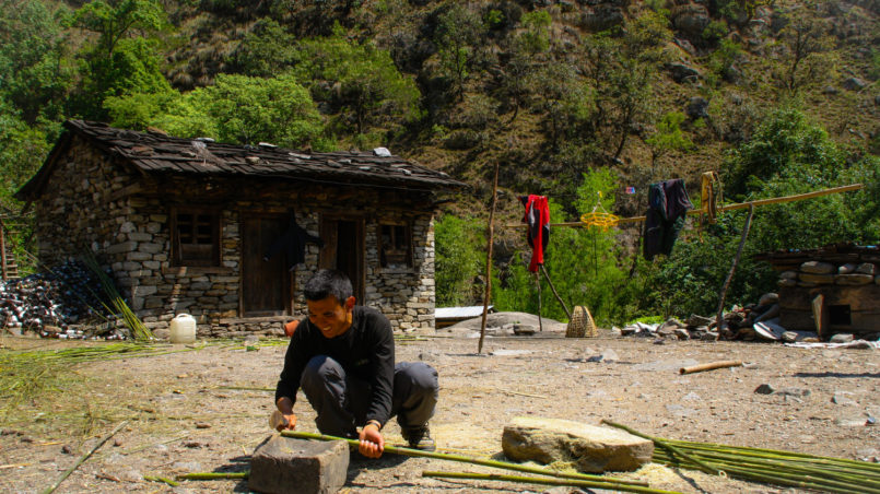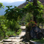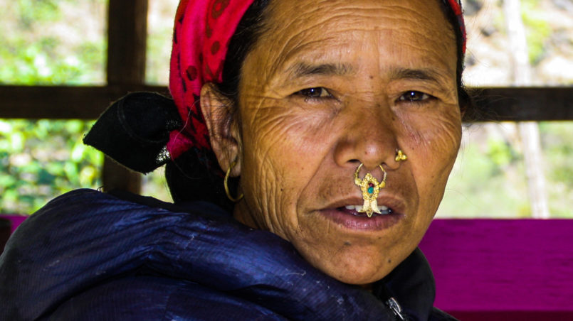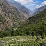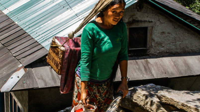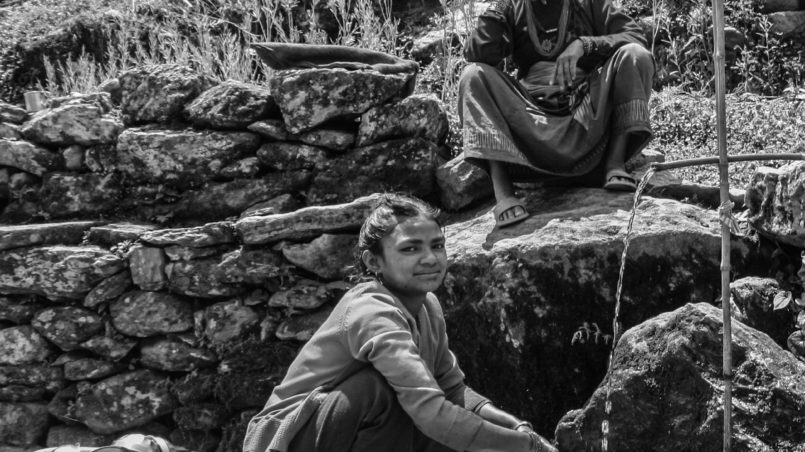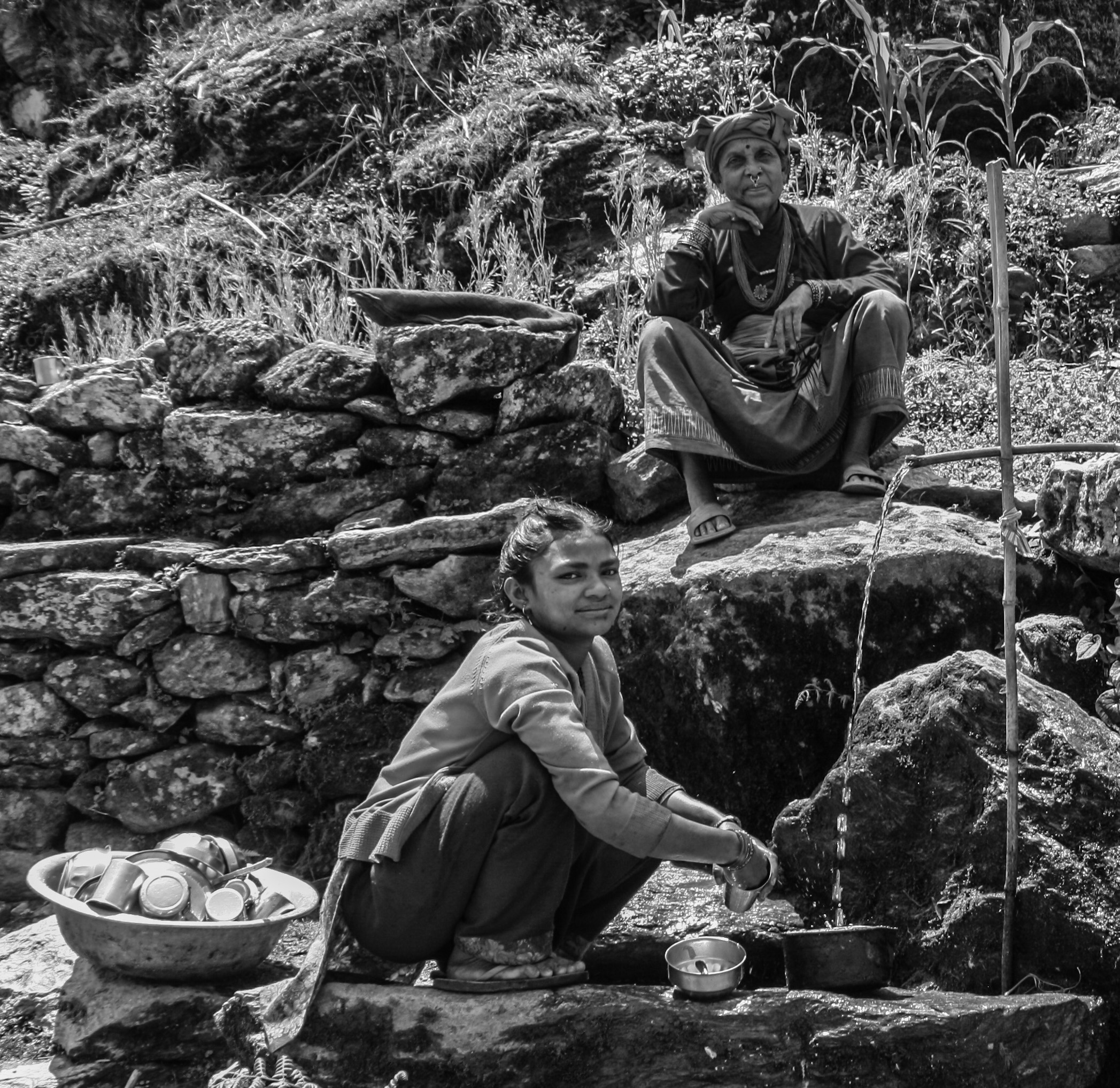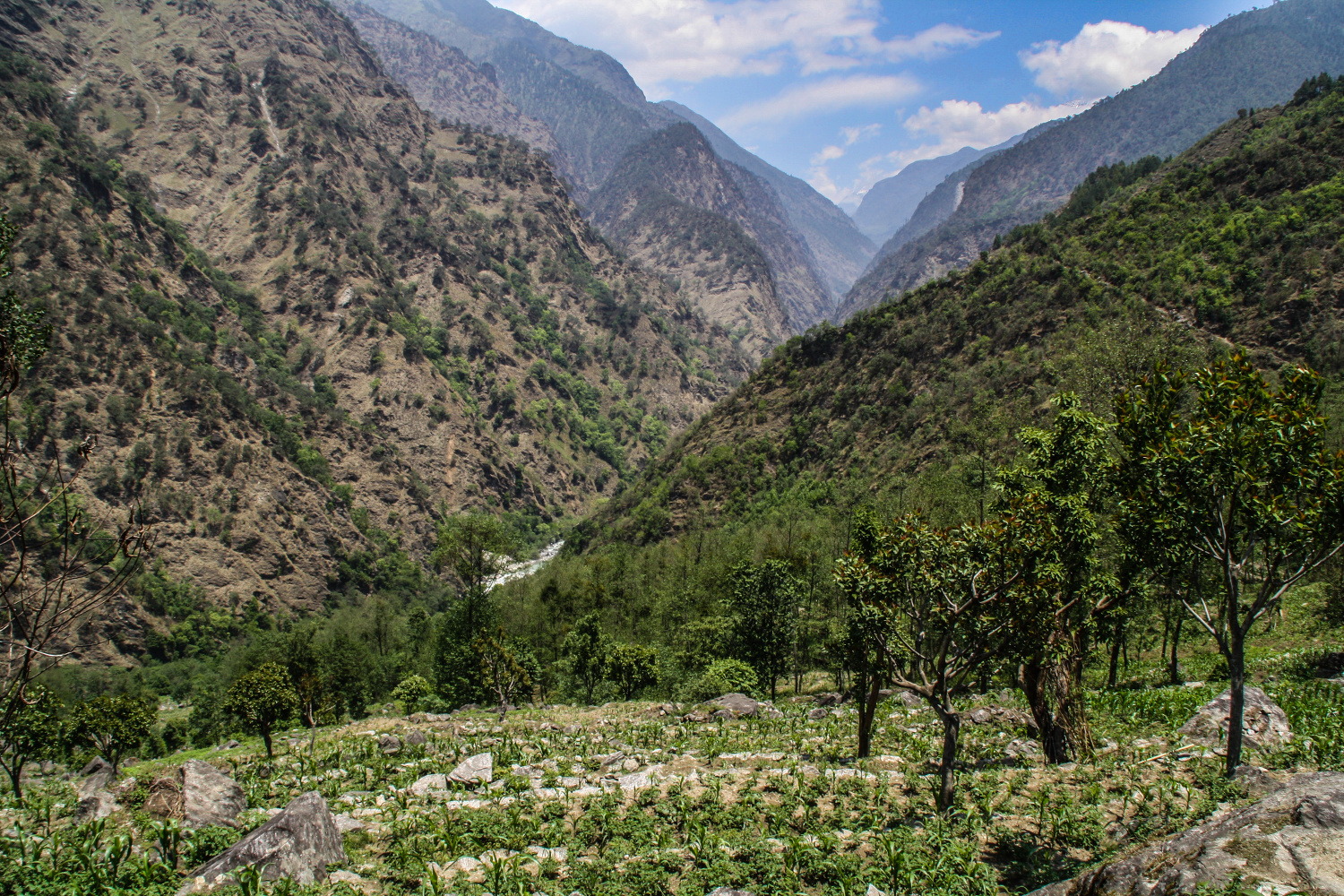 Es ist höchste Zeit, aufzustehen. Ich eile die Stufen hinunter, um mir meine Kleidung zu holen – ich habe sie in der Nacht zum Trocknen aufgehängt, und so konnte sie wohl nicht trocken werden. Also hänge ich die nassen Kleider auf meinem Wäscheständer auf (das ist in diesem Fall mein Rucksack – man lernt sehr schnell, in den Bergen zu improvisieren!). Ich hoffe auf die warme Morgensonne, die bitte alles in Null-Komma-Nichts trocknen lassen solle. Die Wanderung ins Tal ist sehr fein und es regnet nicht. Als wir aber den Fluss erreichen, wissen wir eins ganz genau: Diesen Weg müssen wir wieder hinaufklettern; und so beschaffen wir uns Bambusstöcke, die uns für die Wanderung einen guten Dienst erweisen. Nun erreichen wir eine Hängebrücke – das war für mich das erste Mal, so eine Brücke überhaupt zu Gesicht zu bekommen. Ich bin derart in meinen Gedanken vertieft und lausche meiner Musik, dass ich gar nicht die ganze Herde Esel hinter mir bemerke, die so wie ich die Brücke überqueren möchte. Das Teil schaukelt und ich möchte schon auf dem Absatz kehrt machen – doch das geht natürlich nicht. Also fasse ich meinen gesamten Mut zusammen und gehe einfach weiter, mit dem Blick nach vorne – und bete, dass ich nicht hinunterfalle. Am anderen Ende der Brücke sehe ich nepalesische Frauen, die über diesen Vorfall kichern und lachen. Als ich nun sicher am anderen Ende lande, schlägt mein Herz so schnell und ich muss mich hinsetzen – ganz zum Amusement der einheimischen Damen hier …