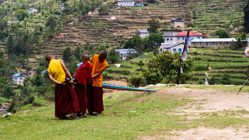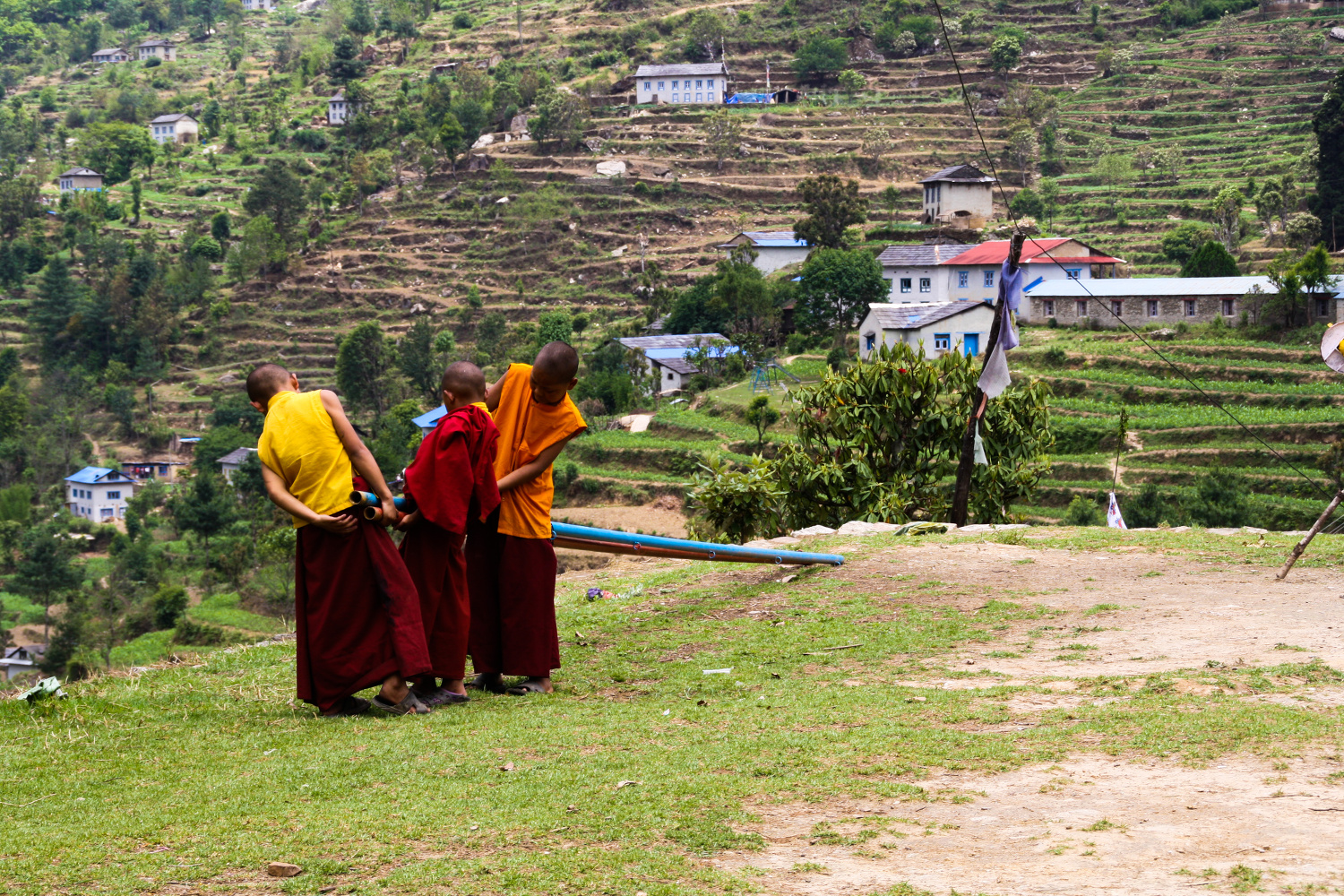 Als wir in Richtung Bupsa, so heißt der Ort, wandern, wo wir unsere Nacht verbringen sollen, begegnen wir einem jungen Mann, der aus der entgegengesetzten Richtung kommt. Er läuft nahezu, oder besser: Er hüpft uns entgegen und wirkt sehr glücklich. Wir halten an, um mit ihm ein Gespräch zu beginnen und finden heraus, dass er soeben den Everest bestiegen hatte, nachdem er es im vorigen Jahr zweimal aufgrund von schlechten Wetterbedingungen nicht schaffte. Als unser Führer ihn erblickt, sagt er: „Nein, das glaube ich nicht, du hast den Everest nicht erklommen, du siehst in deinem Gesicht nicht so gebräunt aus, wie du es solltest.“