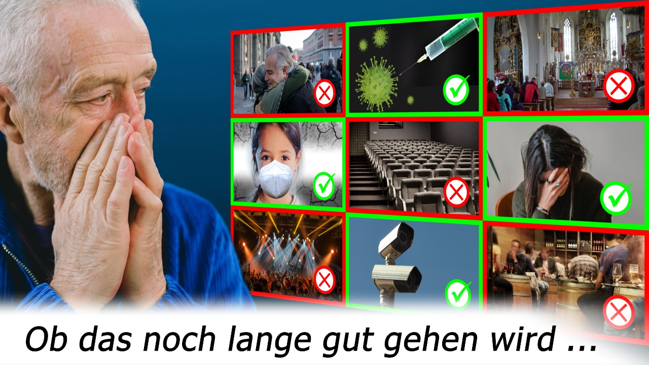 Es ist uns egal, ob der Umweltschutz systematisch ausgehöhlt oder ignoriert wird, uns kümmert es nicht, dass die Grenzen zwischen Konzernen und Regierungen gänzlich aufgehoben werden, dass sich die freie Presse aus freien Stücken gleichschaltet hat. Lasst sie doch an jeder Straßenlaterne dieser Welt eine Kamera installieren, lasst sie unsere Mails lesen und unsere Telefonate abhören, sollen sie doch daran ersticken, mir doch egal, hab nichts zu verbergen. Maskenpflicht, Ausgehverbot, Kontaktsperre, Verbot von Gottesdiensten – ja und? Muss doch sein angesichts dieser furchtbaren Pandemie. Schließung von Restaurants? Da muss die Toskana-Fraktion eben mal zuhause essen. Stilllegung des Kulturbetriebs? So what, wer braucht das in diesen Zeiten? Jetzt haben wir erst einmal Corona …