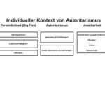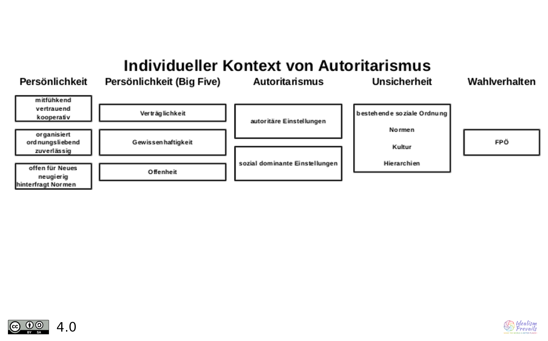 Befindet sich die Persönlichkeit im in der folgenden Grafik ganz links ausgewiesenen Status – zB. mitfühlend, kooperativ, vertrauend – dann wäre sie viel weniger anfällig für autoritäres Verhalten.