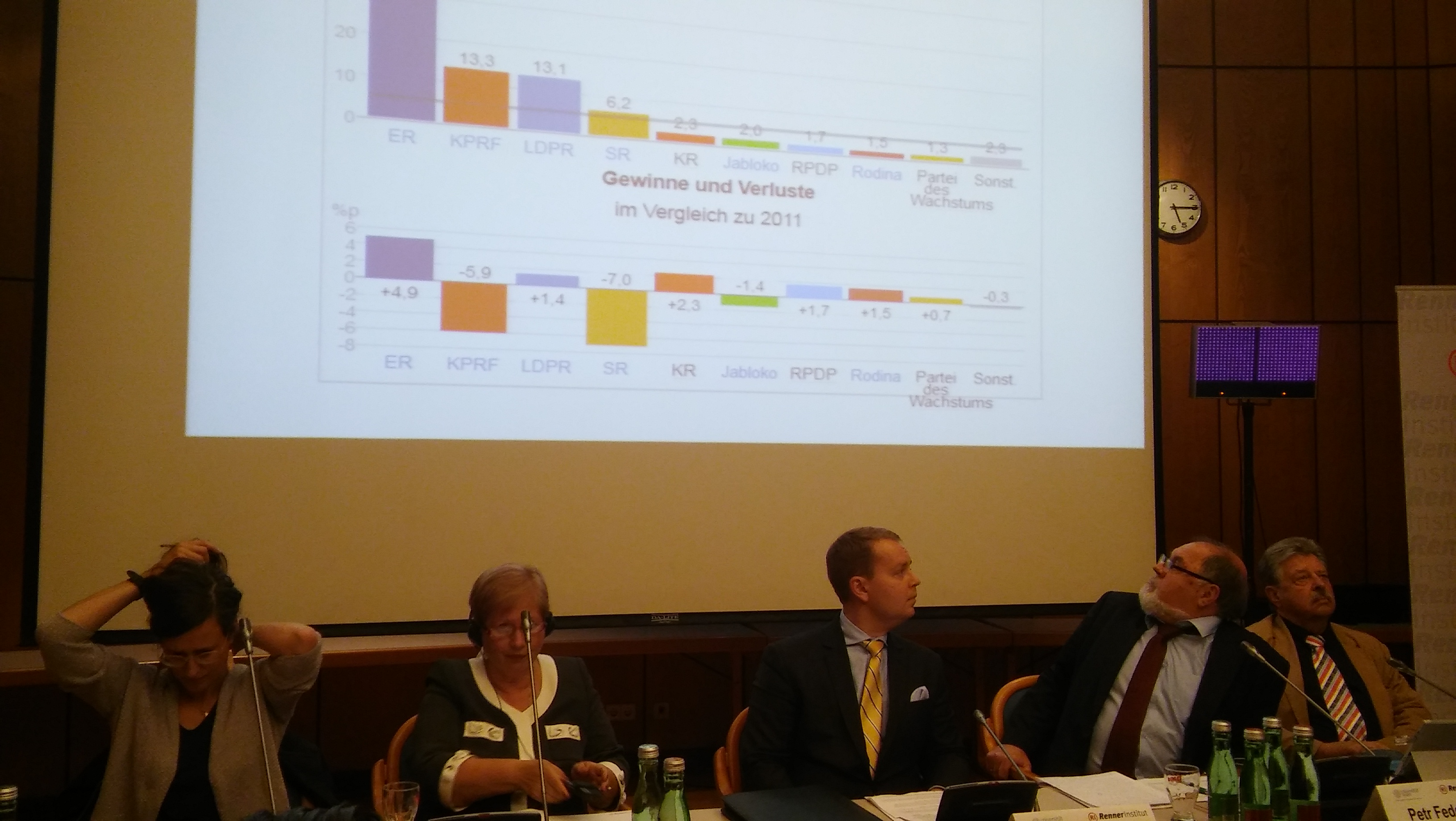 Über die Gründe, warum die Wahlbeteiligung bei nur knapp 48 Prozent lag, waren sich die Diskutanten einig: Der Wahltermin direkt nach der Sommerpause trug ebenso dazu bei wie der kurze, maue Wahlkampf mit wenigen Skandalen und ohne größere Proteste. In Moskau und St. Petersburg lag die Wahlbeteiligung sogar weit unter 40 Prozent. Dieses Fernbleiben der Städter, die traditionell liberal wählen, führte zum überwältigenden Sieg von Putins Partei Einiges Russland. Der Großteil der anderen Parteien, die den Einzug geschafft haben, kann als Systemopposition bezeichnet werden: Sie erkennen die geltenden Spielregeln und Machtverhältnisse an, was man auch daran sieht, daß alle Parteien, die den Einzug in die Duma mit Parteistatus geschafft haben (und das sind nur vier), für eine Vorverlegung der Wahlen gestimmt haben. Zu dieser Systemopposition zählen die rechtsextreme Partei LDPR Wladimir Schirinowskis, die auf Platz drei landete, ebenso, wie die Kommunisten der KPRF. Nur die liberalen Parteien Jabloko und Parnas haben laut Pjotr Fedosov das Ziel, das System nachhaltig zu verändern, blieben aber jeweils klar unter 5 Prozent. Damit haben sie das Problem, daß sie auf Grund ihrer geringen Größe keinen Parteistatus erlangt haben und somit keine finanzielle staatliche Unterstützung erhalten. Hinzu kommt, daß durch die letzte Reformierung des Wahlrechts die private Finanzierung von Parteien stark eingeschränkt wurde. Eine gemeinsame Kandidatur mit anderen Kleinstparteien scheiterte an den zu unterschiedlichen Ansichten. In den kremltreuen Medien wurden die beiden Parteien als Nationalverräter dargestellt. Die Fortschrittspartei von Alexei Nawalny wurde zu den Wahlen gar nicht erst zugelassen.